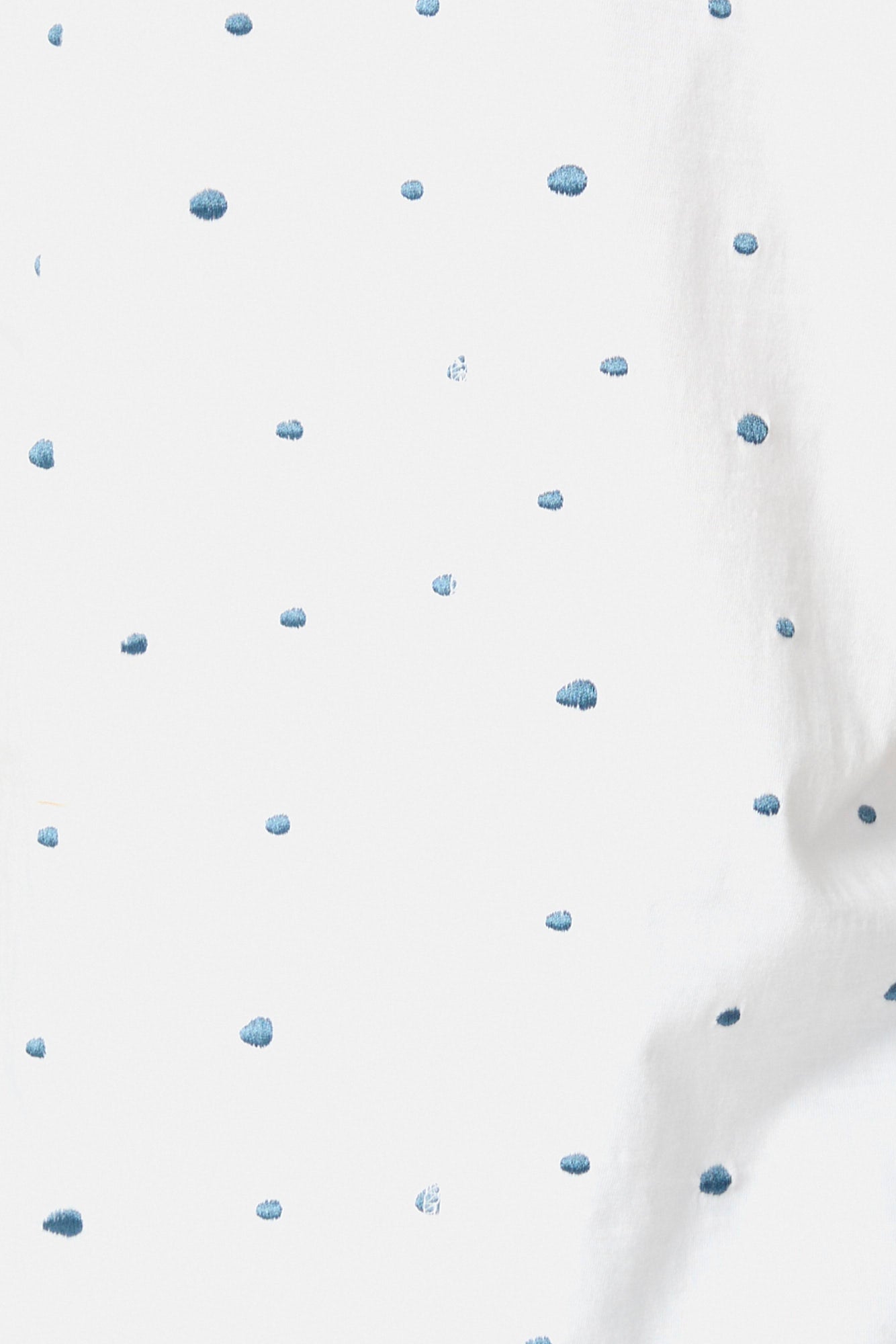 Refresh your wardrobe with the playful charm of the Addison Elbow Sleeve Spot Top in White/Blue. Featuring a classic polkadot print, this breezy style is accented with stitched trim detailing for added character. The wide neckline and elbow-length sleeves create a flattering shape, while the set-in sleeve ensures a polished finish perfect for casual or elevated looks.