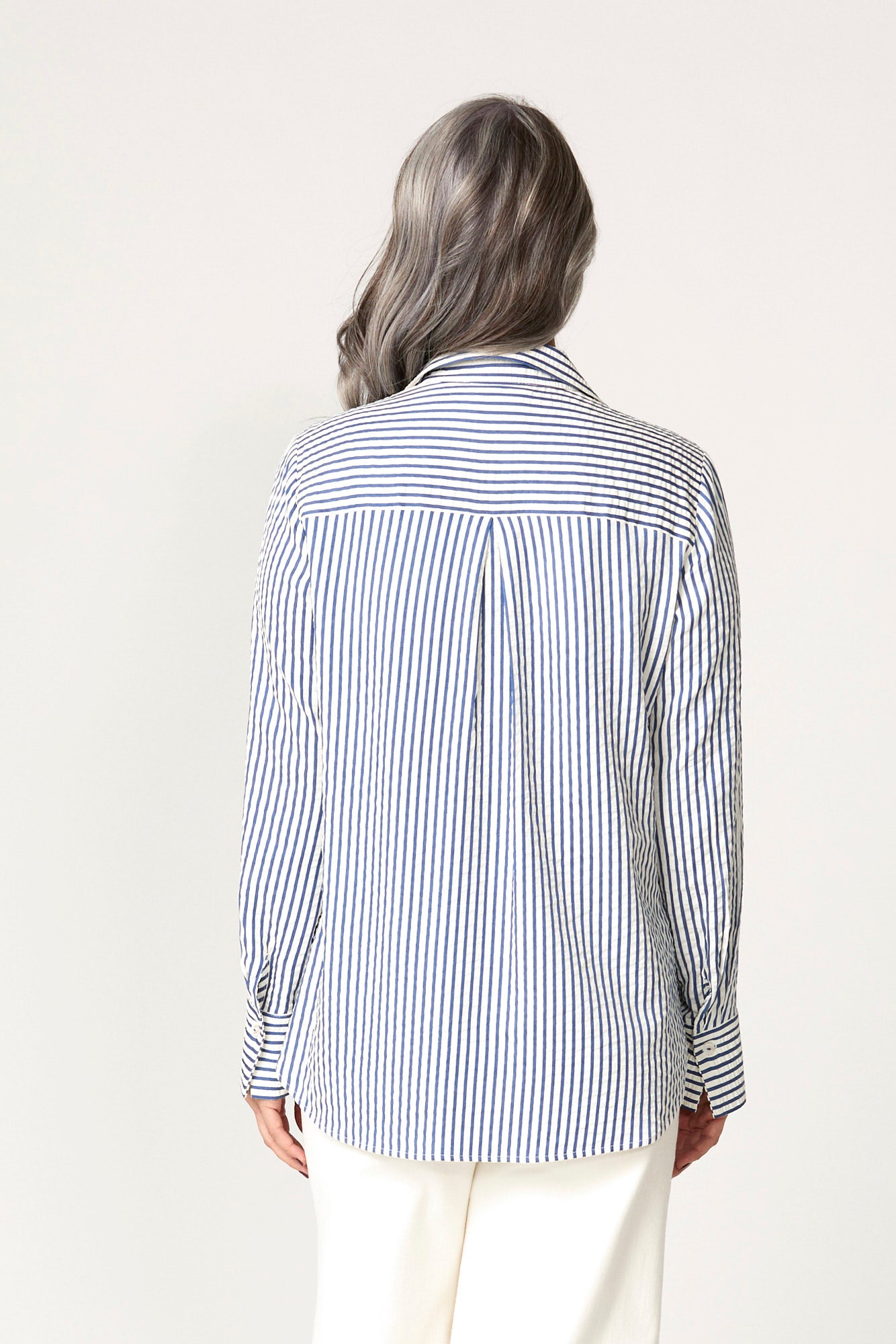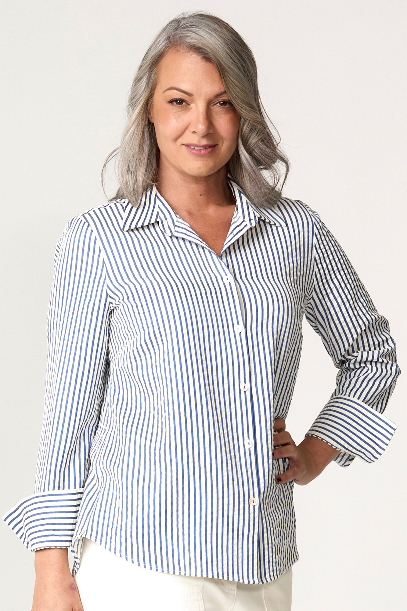 The stripe detail adds visual interest while keeping the overall shape easy to style. A button-down front keeps the look classic and makes the piece easy to wear open or closed. A curved hem adds coverage at the back and softens the line for an easy finish. Made in Australia, it brings local production to a piece designed for regular rotation and frequent wear.