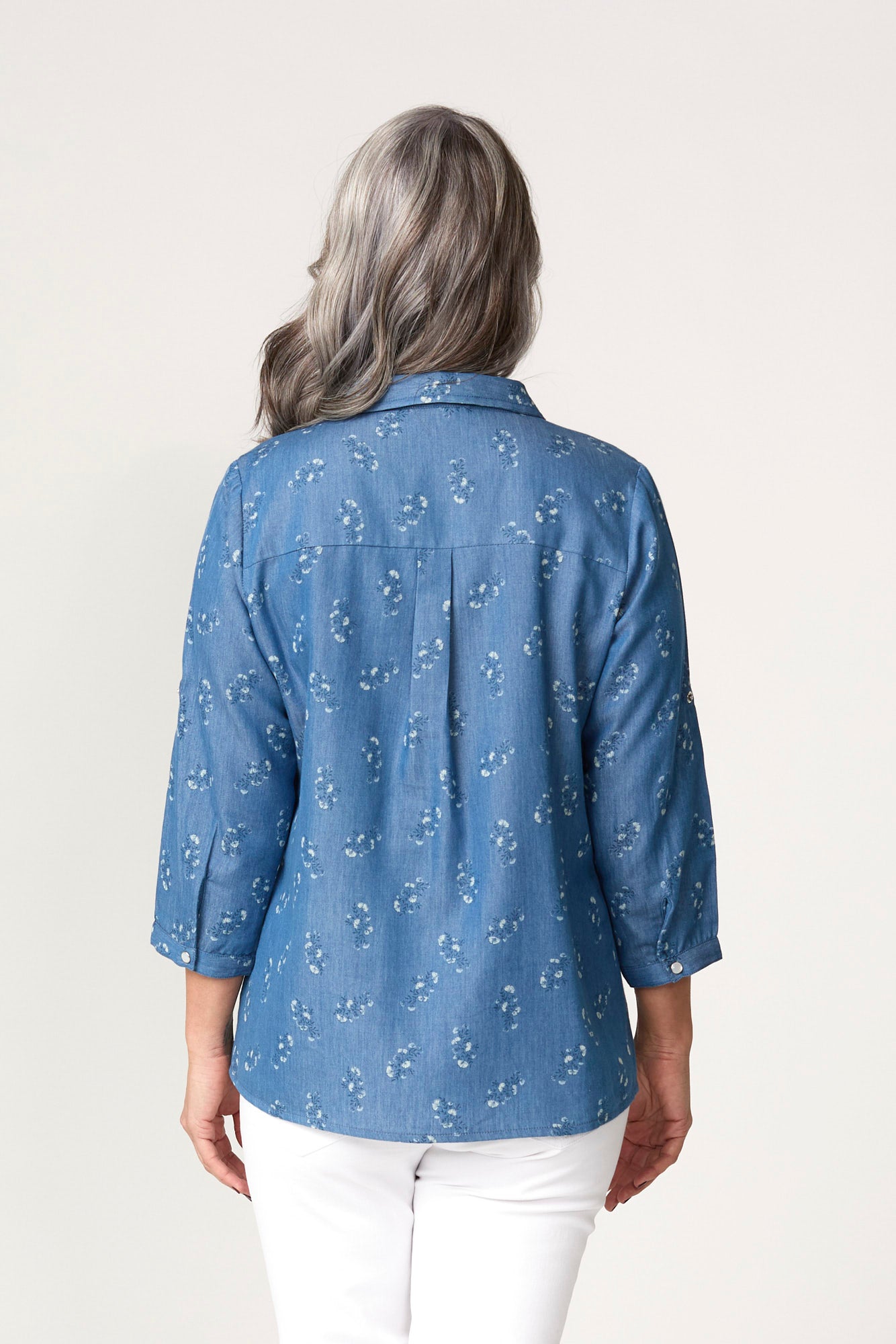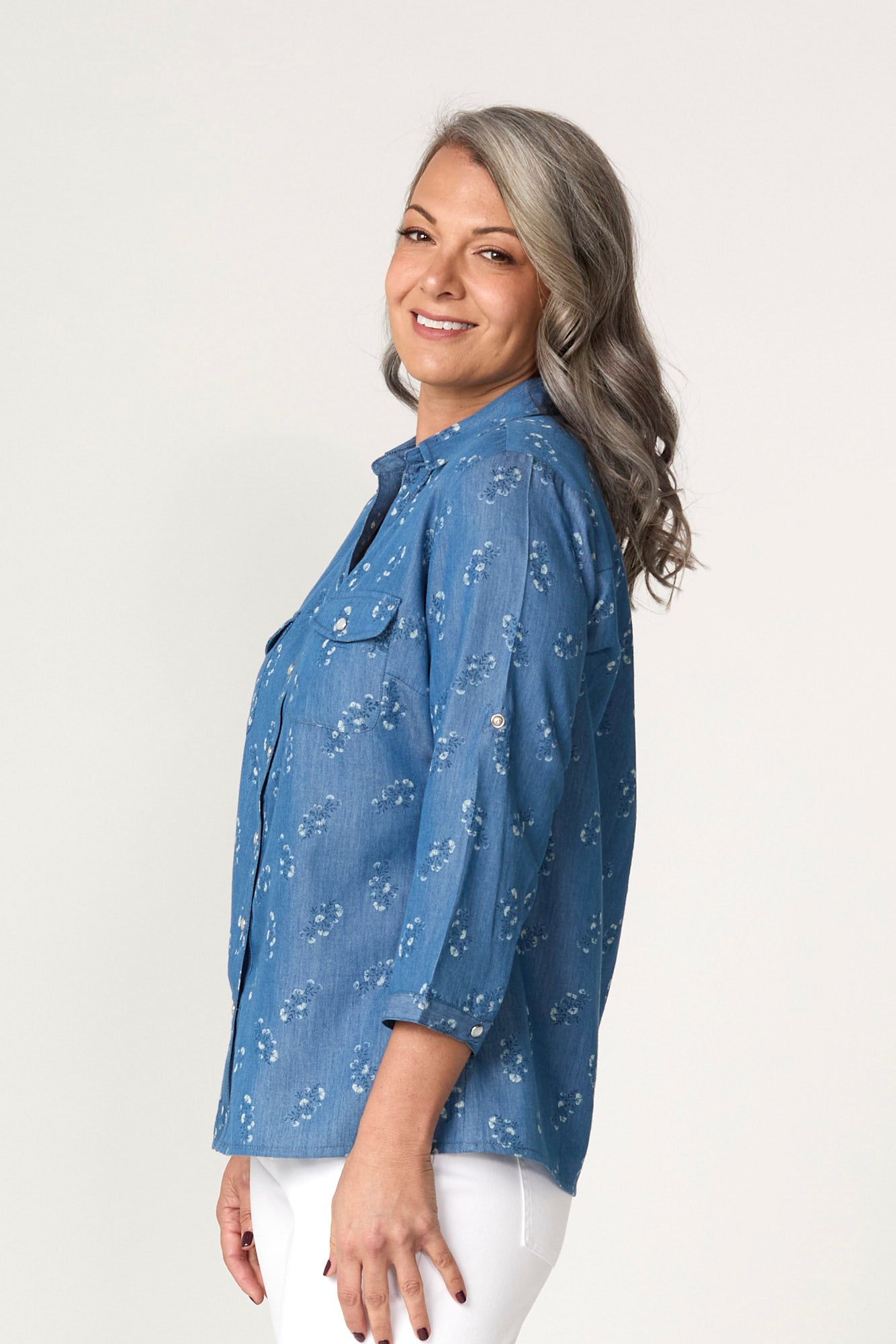 Refresh your casual collection with the Avignon 3/4 Sleeve Shirt in Chambray. Crafted from a soft, lightweight fabric with floral detailing, this shirt blends structure and femininity. The western-style chest pockets and V-insert neckline add a modern touch to its classic design, perfect for effortless everyday wear.
