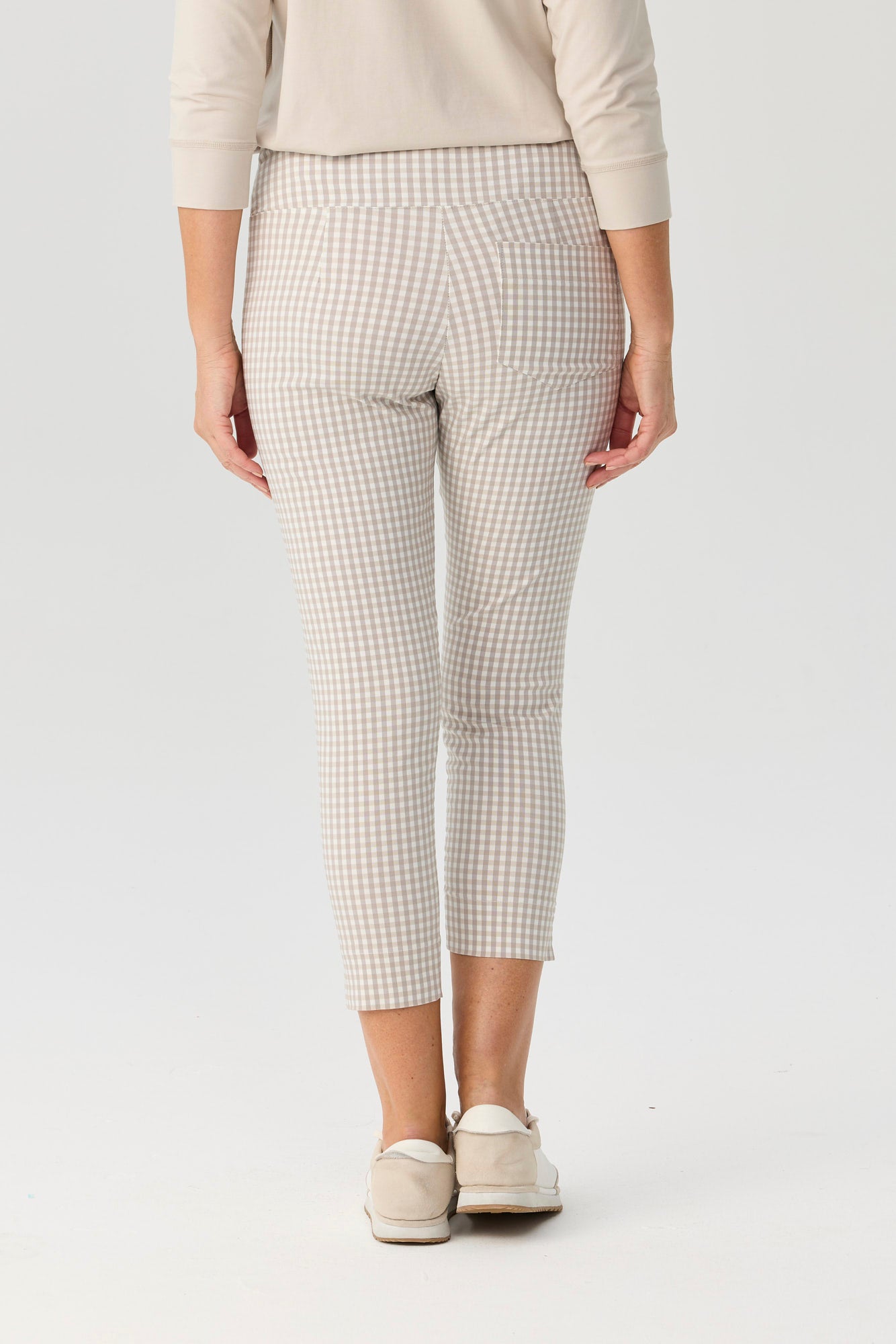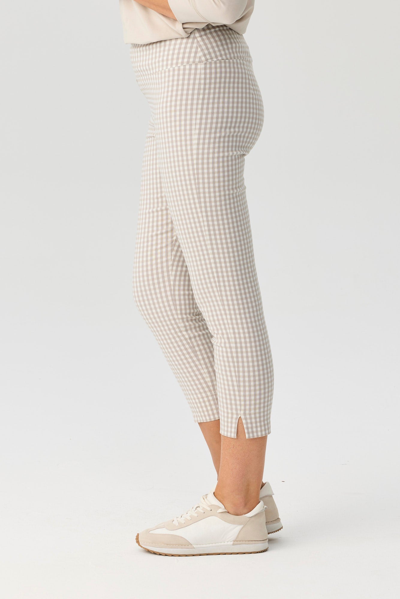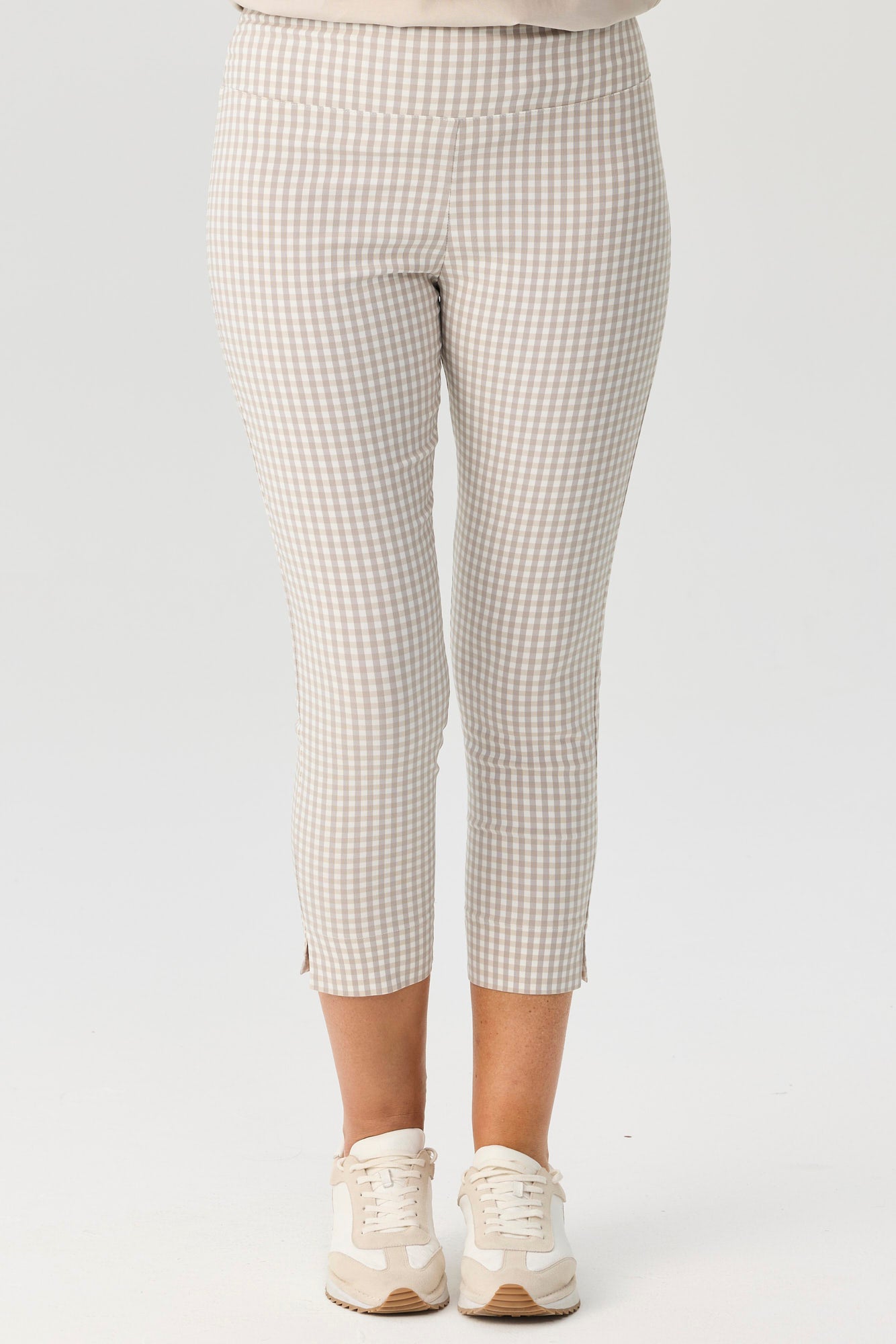 Add timeless flair to your wardrobe with the Bayside Check 7/8 Basque Pant in Natural/White. These classic straight-leg pants feature a tailored check print and a flattering 7/8 length, perfect for versatile styling. Crafted from stretch woven fabric, they offer ease of movement and a comfortable pull-on fit, while subtle side hem splits complete the look with a refined touch.