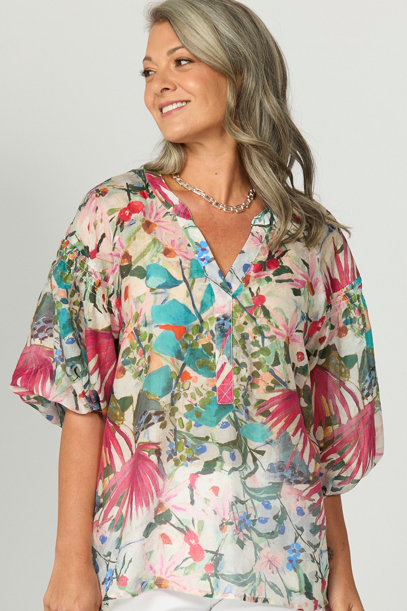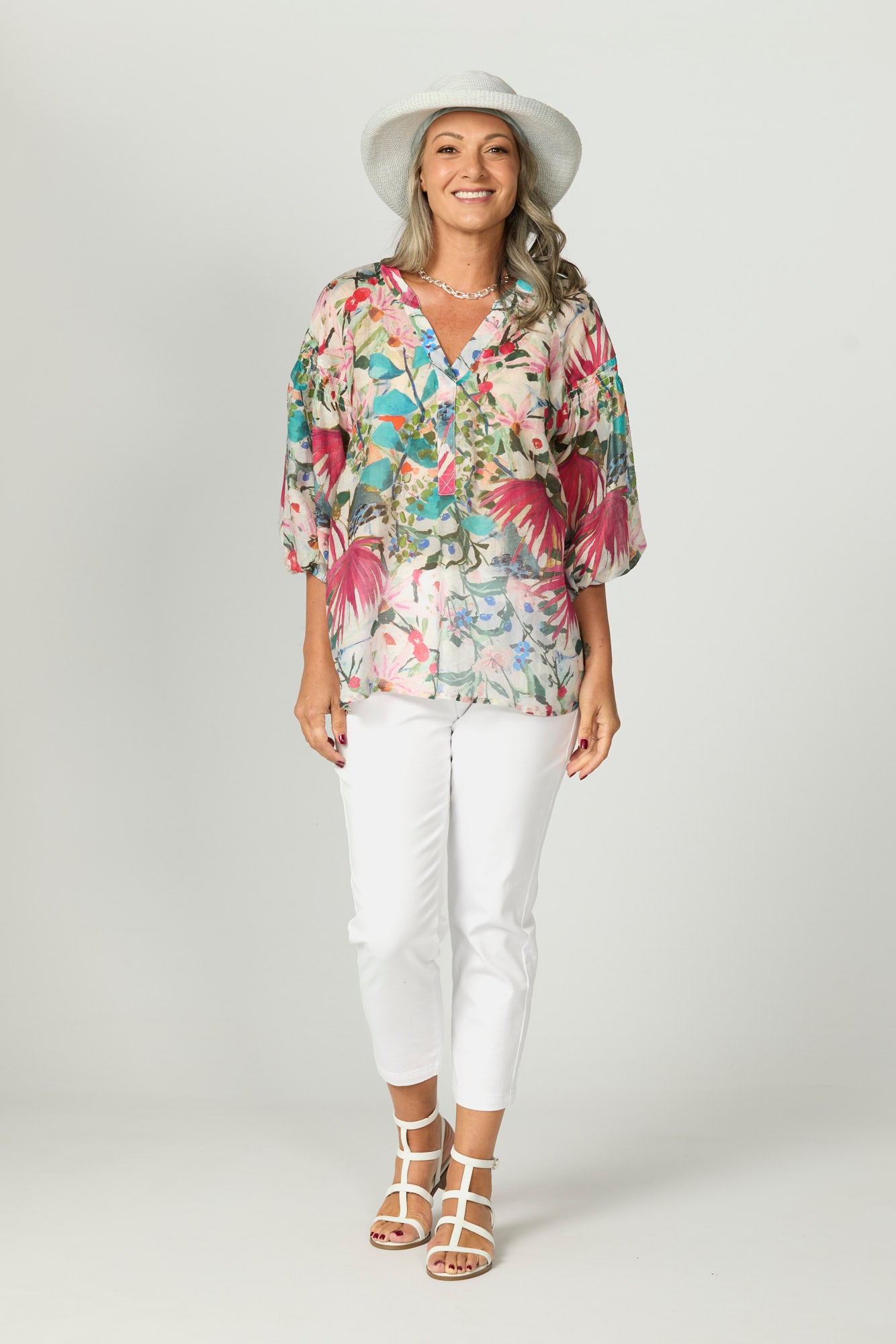 Breathe new life into your wardrobe with the Botanical 3/4 Sleeve Smocked Top in Multi. Featuring an overscale painterly floral print, this top brings a burst of colour and softness to your look. The shirred raglan sleeves and gathered cuffs add texture, while the curved hem enhances its graceful drape.