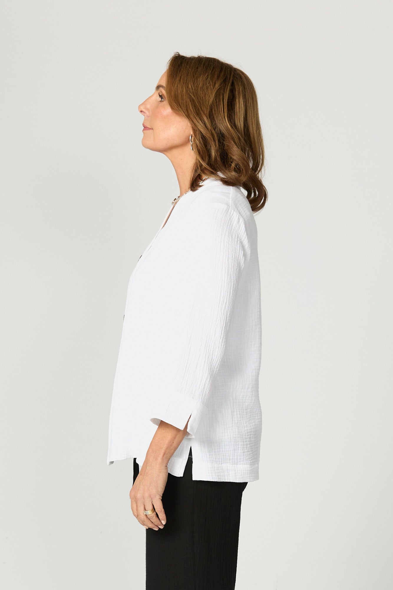 Add a touch of relaxed sophistication to your wardrobe with the Bubble 3/4 Sleeve Shacket in White. Proudly made in Australia, this versatile piece blends the structure of a shirt with the comfort of a jacket. Featuring a flattering V neckline and contemporary side hem splits, it’s perfect for layering across seasons. The wide cuffed sleeves with subtle splits complete the modern silhouette with ease and movement.