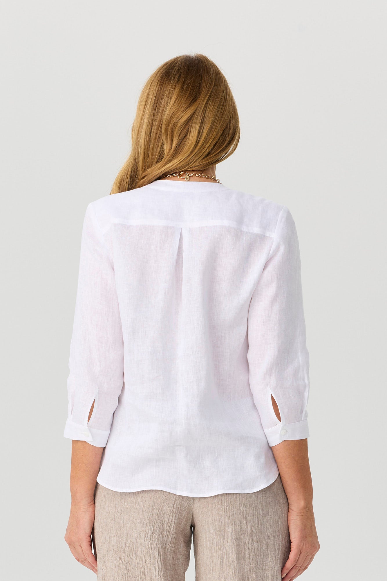 Step into relaxed elegance with the Caledonia Collarless 3/4 Sleeve Shirt in White. Made in Australia from luxe 100% linen, this breathable piece offers a refined silhouette with thoughtful detailing. The round neckline flows into a subtle V-insert and button-down placket, while its curved hem and cuffed sleeves add structure to its easy, relaxed fit—perfect for warm days or smart-casual layering.