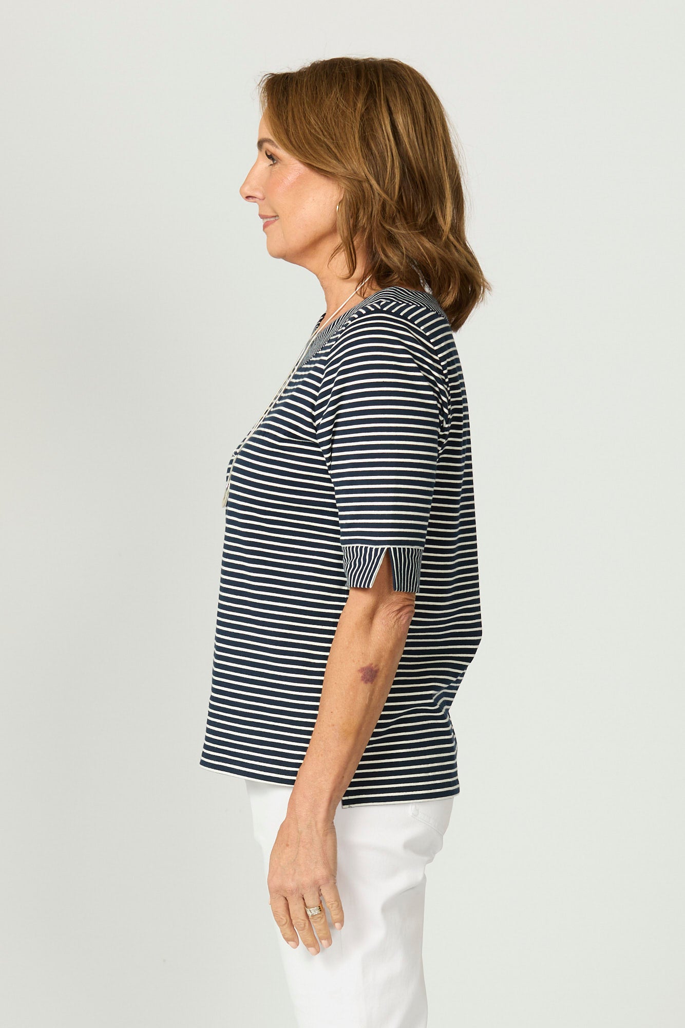 Refresh your casual look with the Corsa Stripe Elbow Sleeve Tee in Navy/White. This timeless striped tee features bold contrast detailing at the neckline and cuffs, bringing a modern edge to a classic favourite. With a wide neckline and side hem splits, it offers effortless comfort and laid-back style.