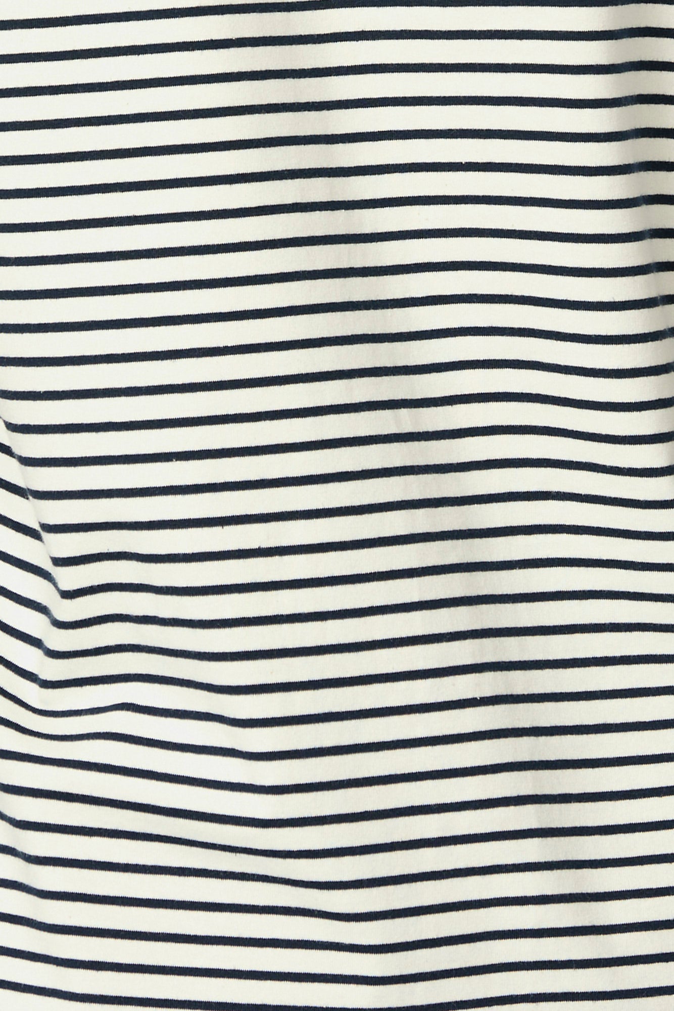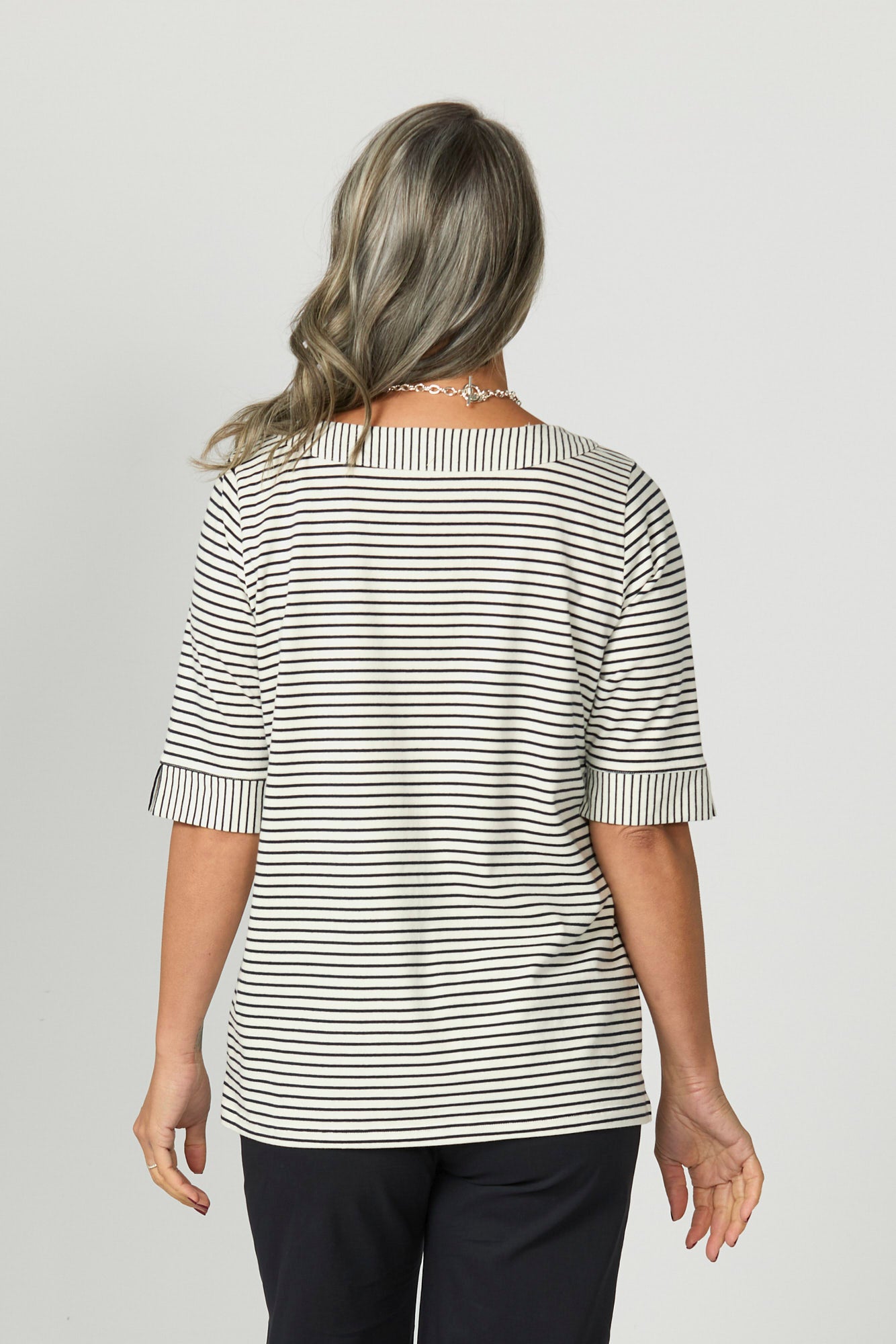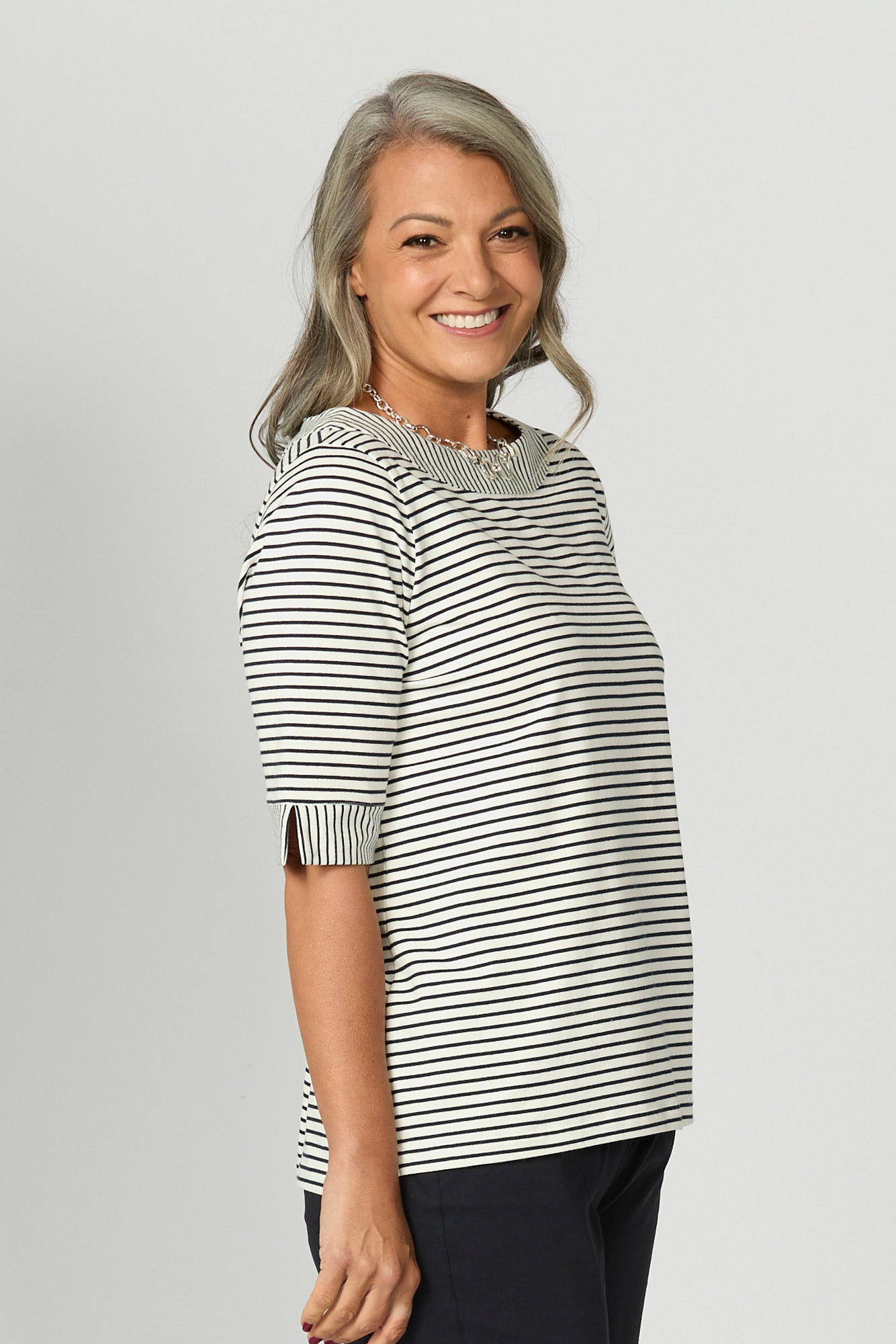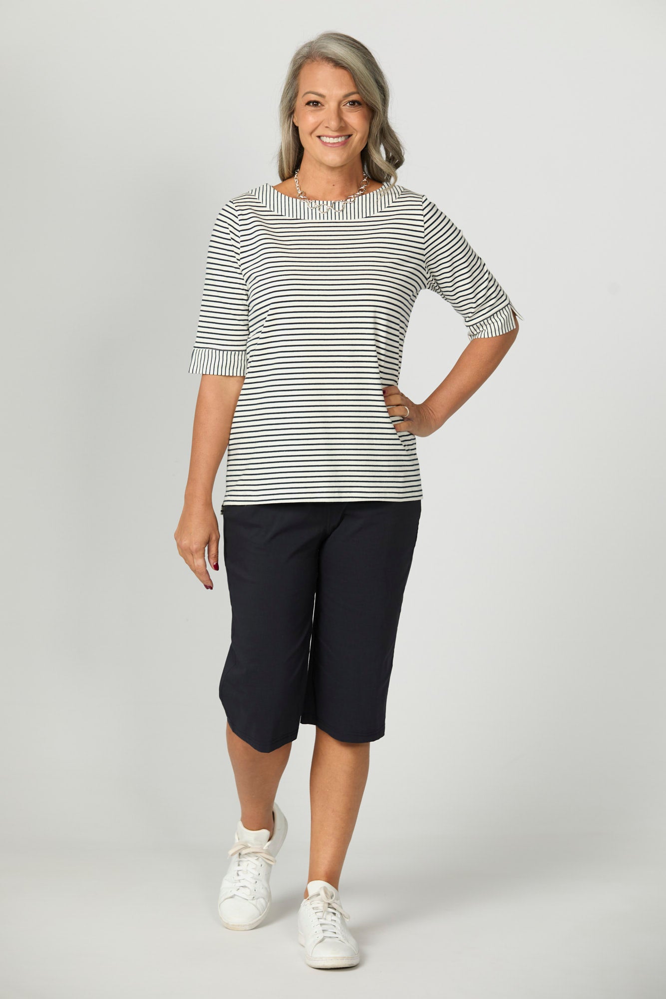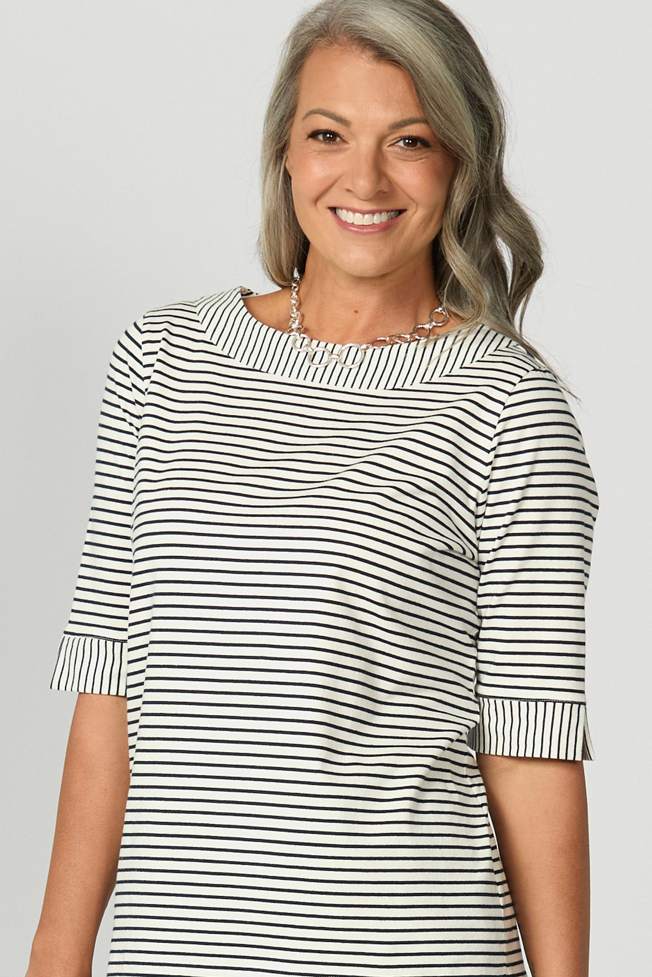 Sail into style with the Corsa Contrast Elbow Sleeve Tee in White/Navy. This crisp striped tee adds a nautical twist with contrast stripe detailing at the neckline and cuffs. Designed for all-day comfort, it features a wide neckline, elbow-length sleeves, and side hem splits for easy movement and a relaxed silhouette.