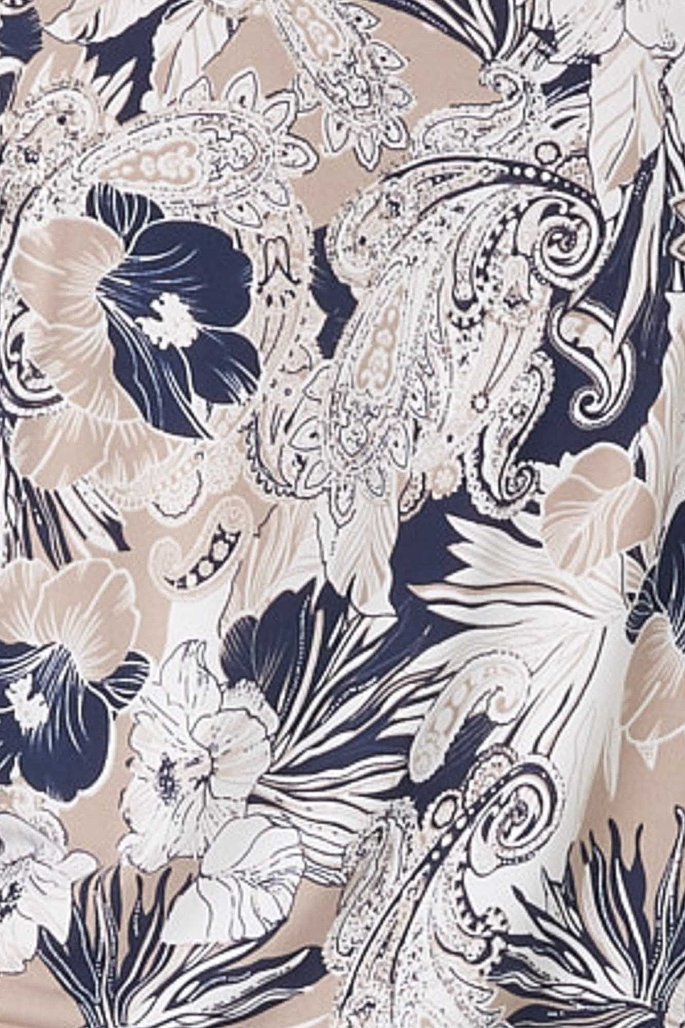 Discover the elegance of the Cummins V Neck Elbow Sleeve Top in Navy/Natural. This Australian-made top features a graphic tonal floral print that adds a stylish flair. The V-neck opening with self-fabric neck bind ensures a neat finish, while the elbow-length sleeves with side splits at the cuffs provide a comfortable fit. Additional side splits at the hem offer ease of movement and a modern touch.