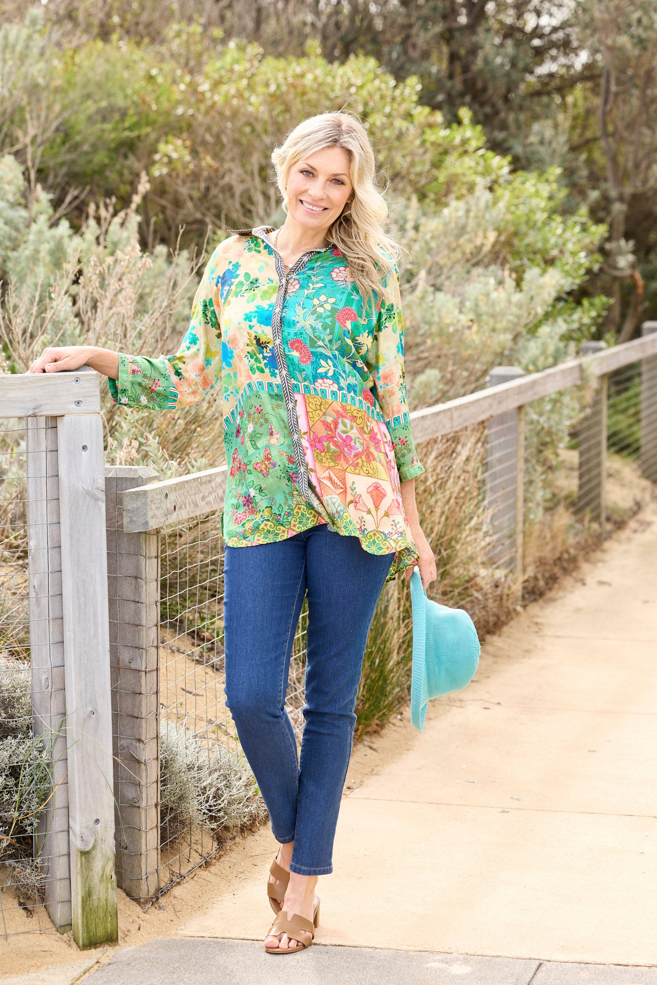 Brighten up your wardrobe with the Dandy Relaxed 3/4 Sleeve Shirt in Multi Tile. Featuring a playful patchworked floral print, this relaxed-fit shirt blends charm and comfort effortlessly. Contrast detailing at the collar and placket adds a stylish edge, while rolled cuffs with tab button closures and curved hems provide a laid-back finish.