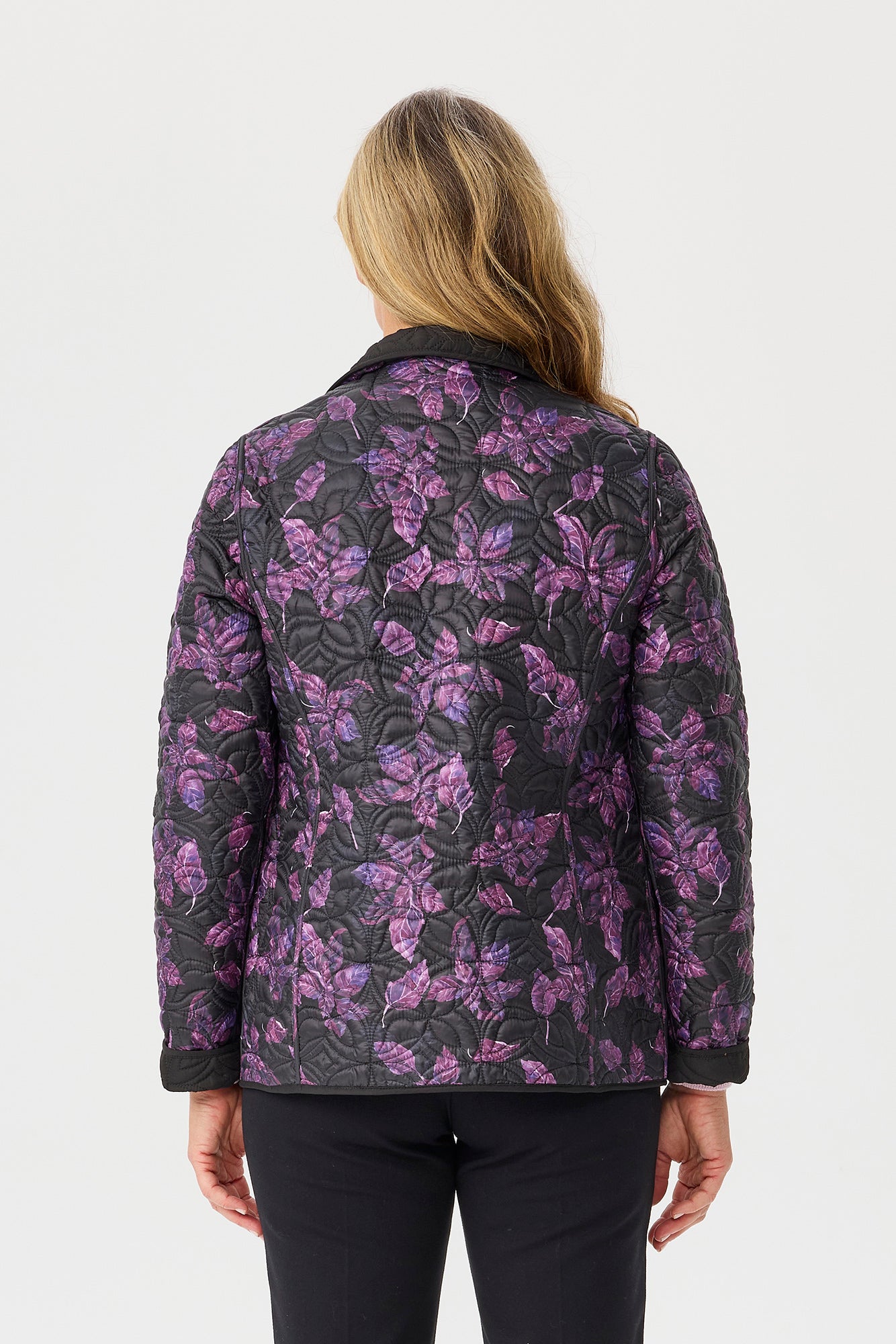 Wrap up in versatile style with the Della Reversible Print Jacket in Black/Mulberry. Designed for travel-friendly layering this quilted jacket offers two looks in one with a floral tonal print outer and a solid inner side. Finished with a stand collar silver press stud front and thoughtful seam detailing it brings both polish and practicality to cooler days.