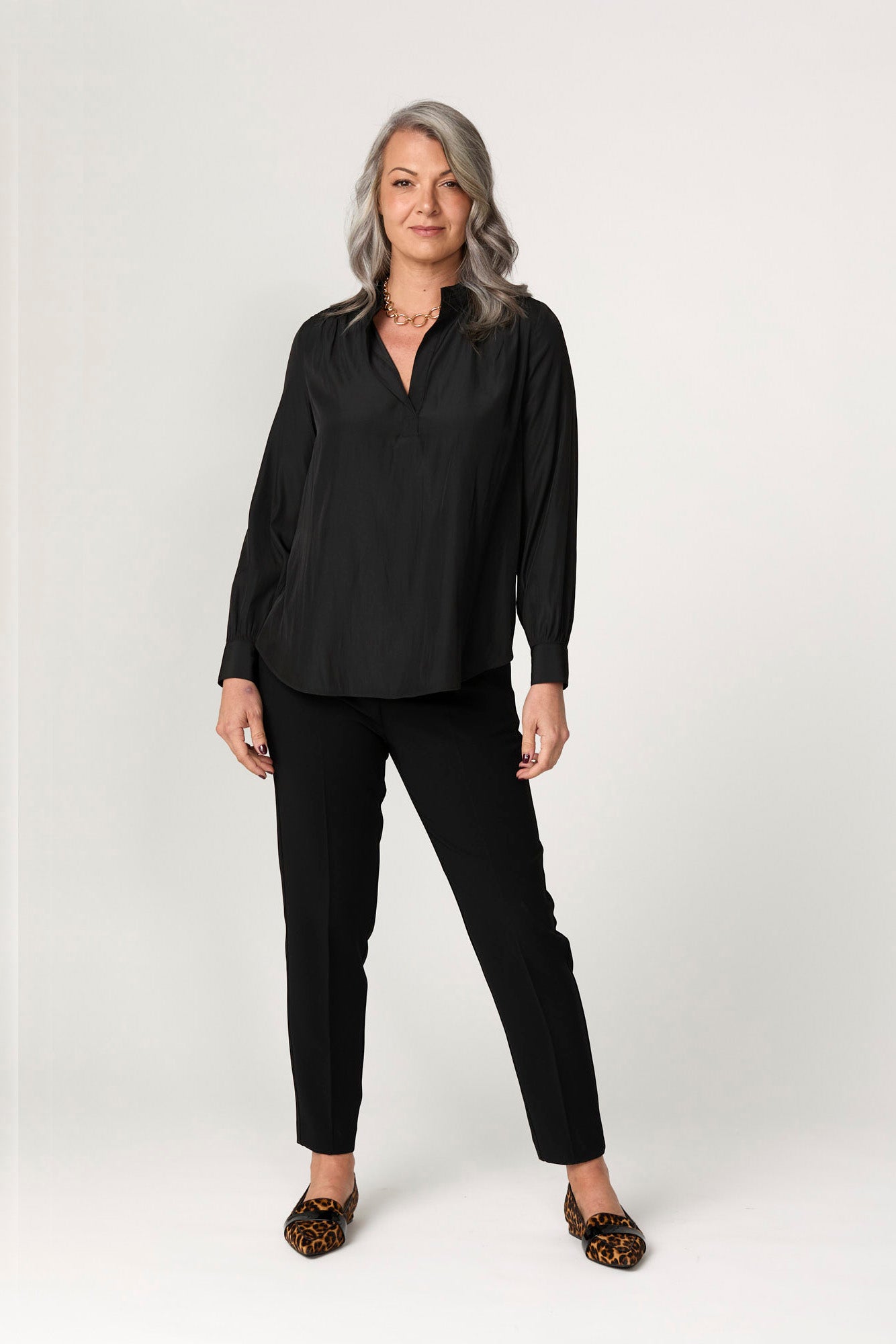 Add effortless elegance to your wardrobe with the Desire V-Neck Soft Blouse in Black. This blouse features a round neckline with a V-insert, complemented by front and back yoke seams with delicate gathering. The long set-in sleeves with cuffs and a curved hem enhance the flowing silhouette, while the soft, silky hand feel offers all-day comfort.