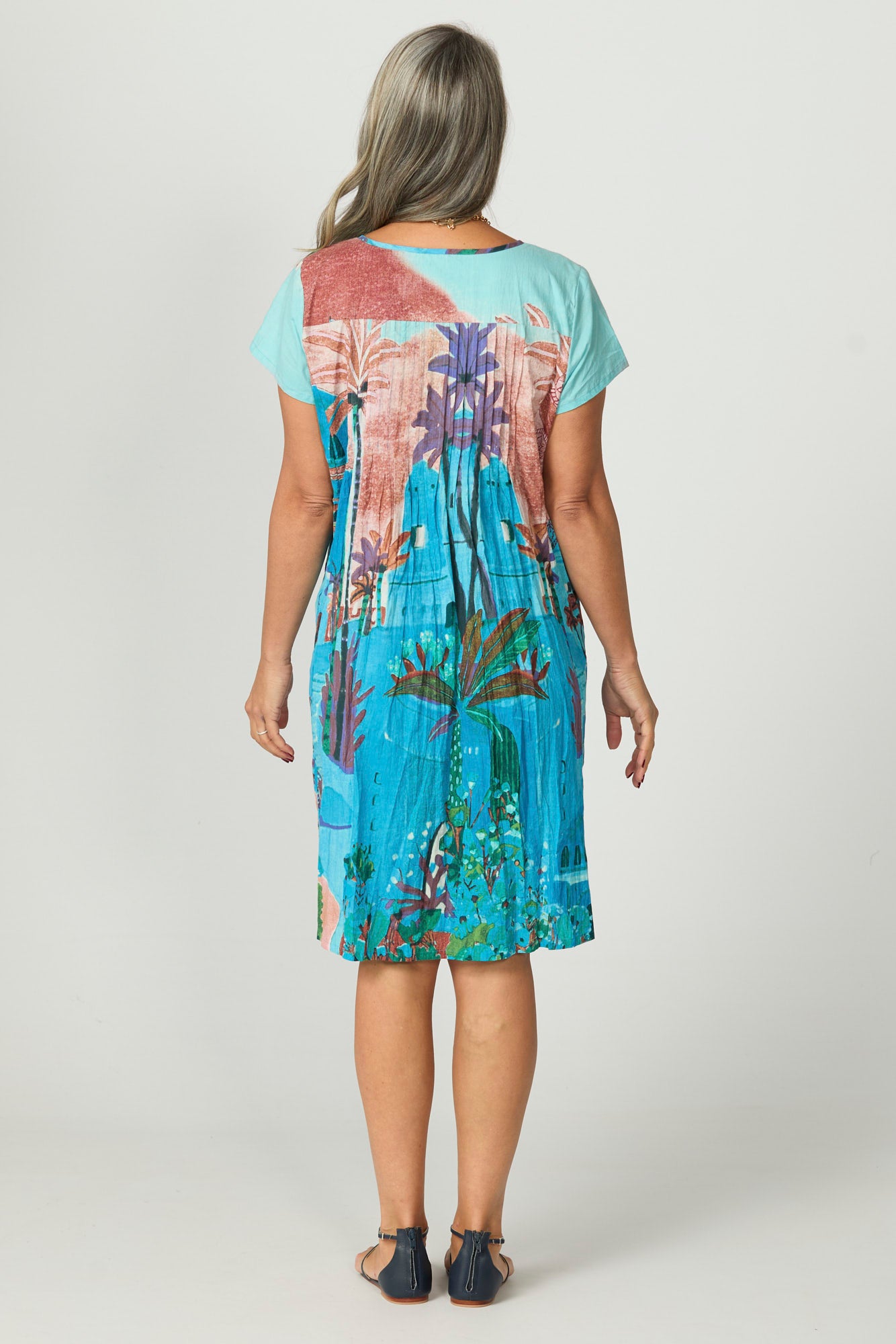 Step into vibrant comfort with the Easy Fit Short Sleeve Dress in Arabian Nights. Crafted from 100% cotton, this colourful printed dress is your go-to for effortless style. Featuring a flattering V neckline with mini front pleats and functional button detailing, it’s finished with handy front inner pockets for everyday ease.