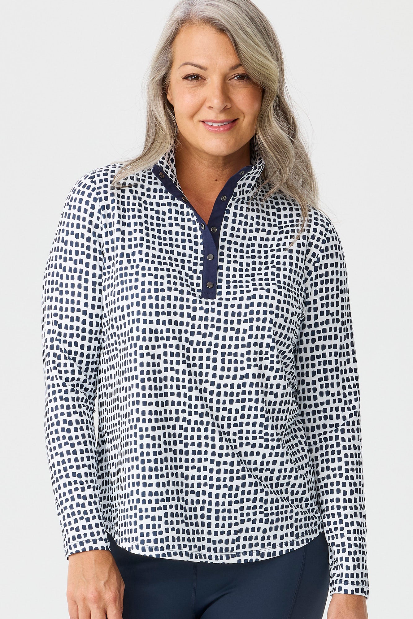 The Escape Long Sleeve Stud Neck Polo Top in Navy Tiles is a top that delivers all-day comfort for daily routines. A collared neckline adds a clean, structured finish and keeps the upper line neat. Long sleeves add extra coverage and make the piece useful when the weather turns cooler. Mini length keeps the hem light and makes the piece easy to move in.