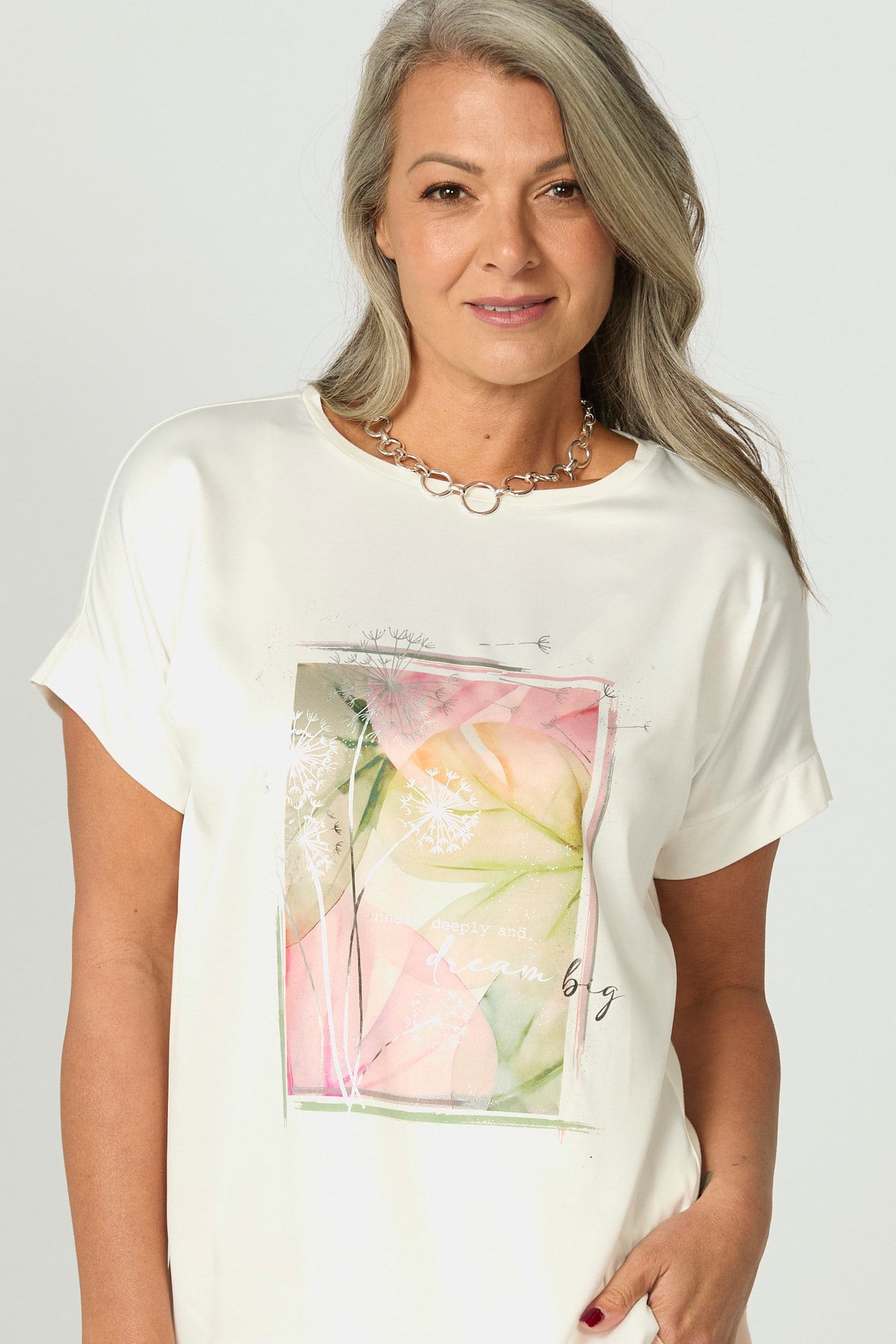 Bring a pop of artistry to your everyday style with the Esta Print Front Short Sleeve Top in White Multi. This relaxed drop shoulder tee features a bold placement print across the front, offering a fresh, modern look. Finished with a round neckline and side hem splits, it's the perfect blend of comfort and charm.