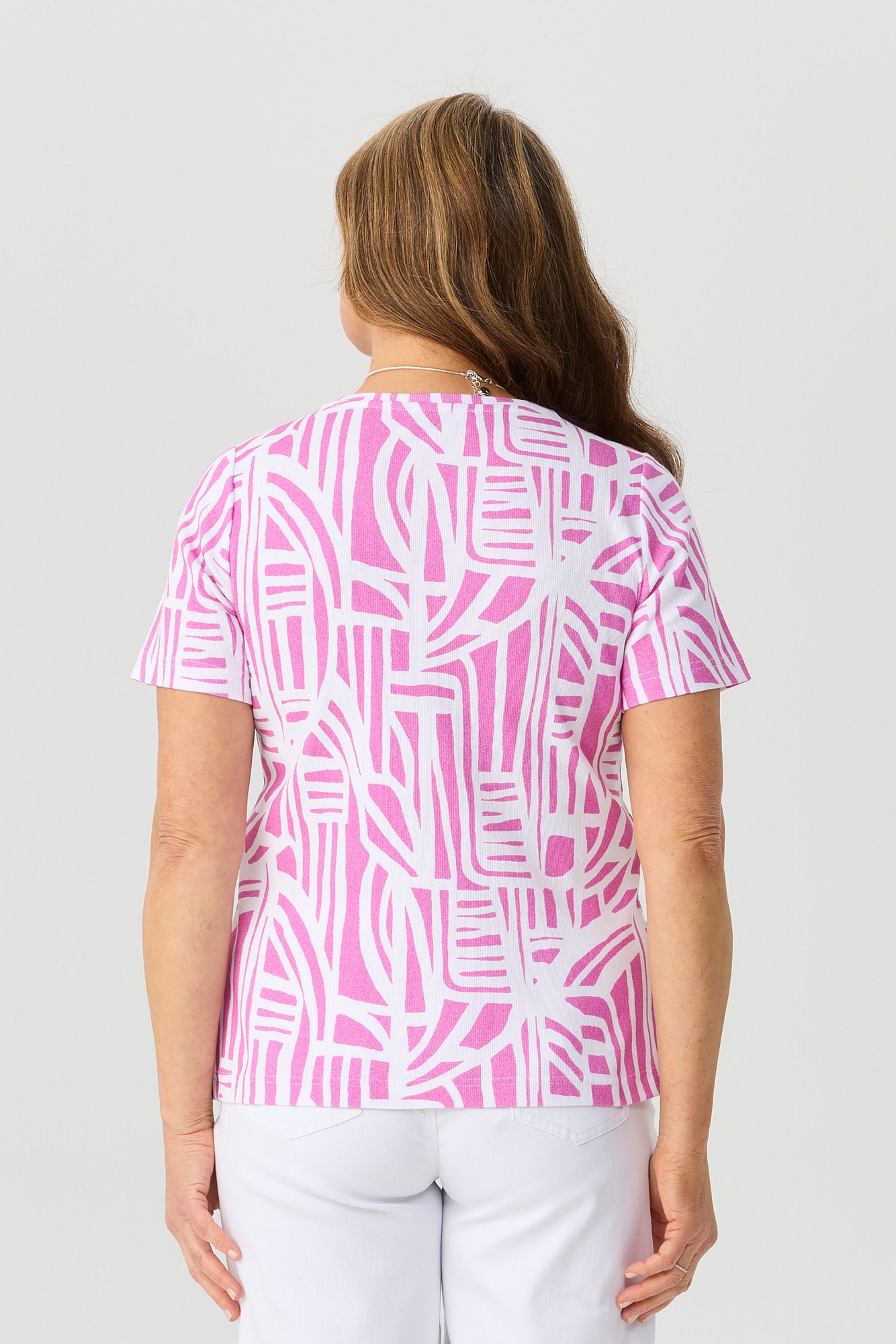 Bring subtle sophistication to your casual wardrobe with the Express S/S Print Tee in Pink. Designed with an eye-catching abstract two-colour print, this tee offers an easy fit and timeless appeal. Crafted from soft cotton with a touch of stretch, it features a round neckline with self-bind, side splits at the hem, and short set-in sleeves for all-day comfort and movement.
