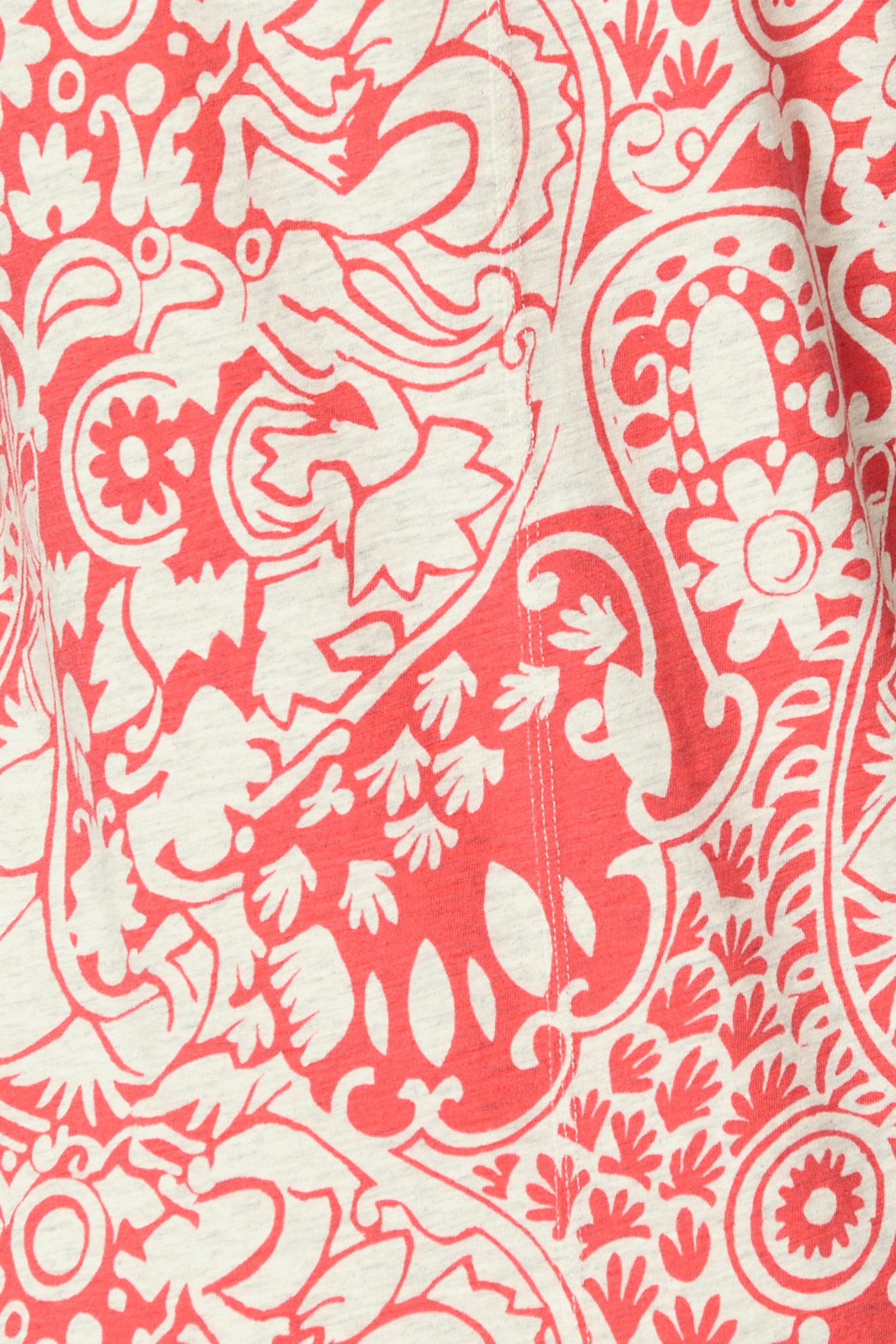 Brighten your everyday style with the Folie Notch Neck Cap Sleeve Tee in Guava. Crafted from soft 100% cotton jersey, this vibrant tee features a lively paisley graphic print and a relaxed silhouette. The round neckline flows into a short V-neck opening, complemented by centre front seam detailing and a flattering dropped shoulder cap sleeve for effortless charm and comfort.