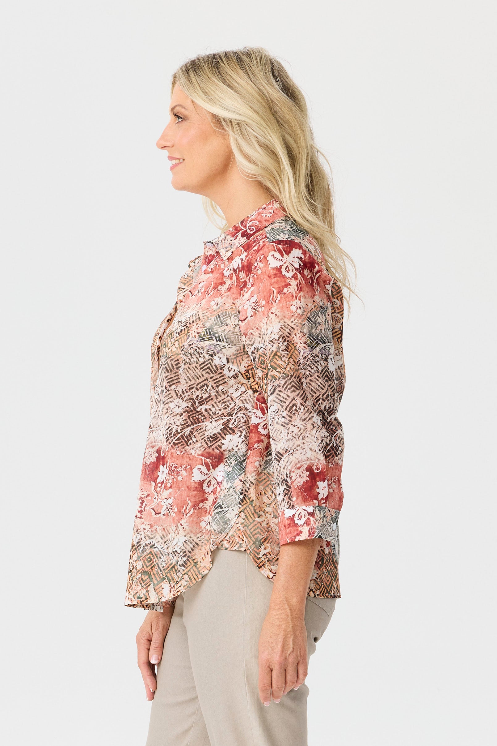 The print detail adds visual interest while keeping the overall shape easy to style. A button-down front keeps the look classic and makes the piece easy to wear open or closed. A curved hem adds coverage at the back and softens the line for an easy finish. The overall cut makes it easy to wear on its own or under a light layer when temperatures shift.