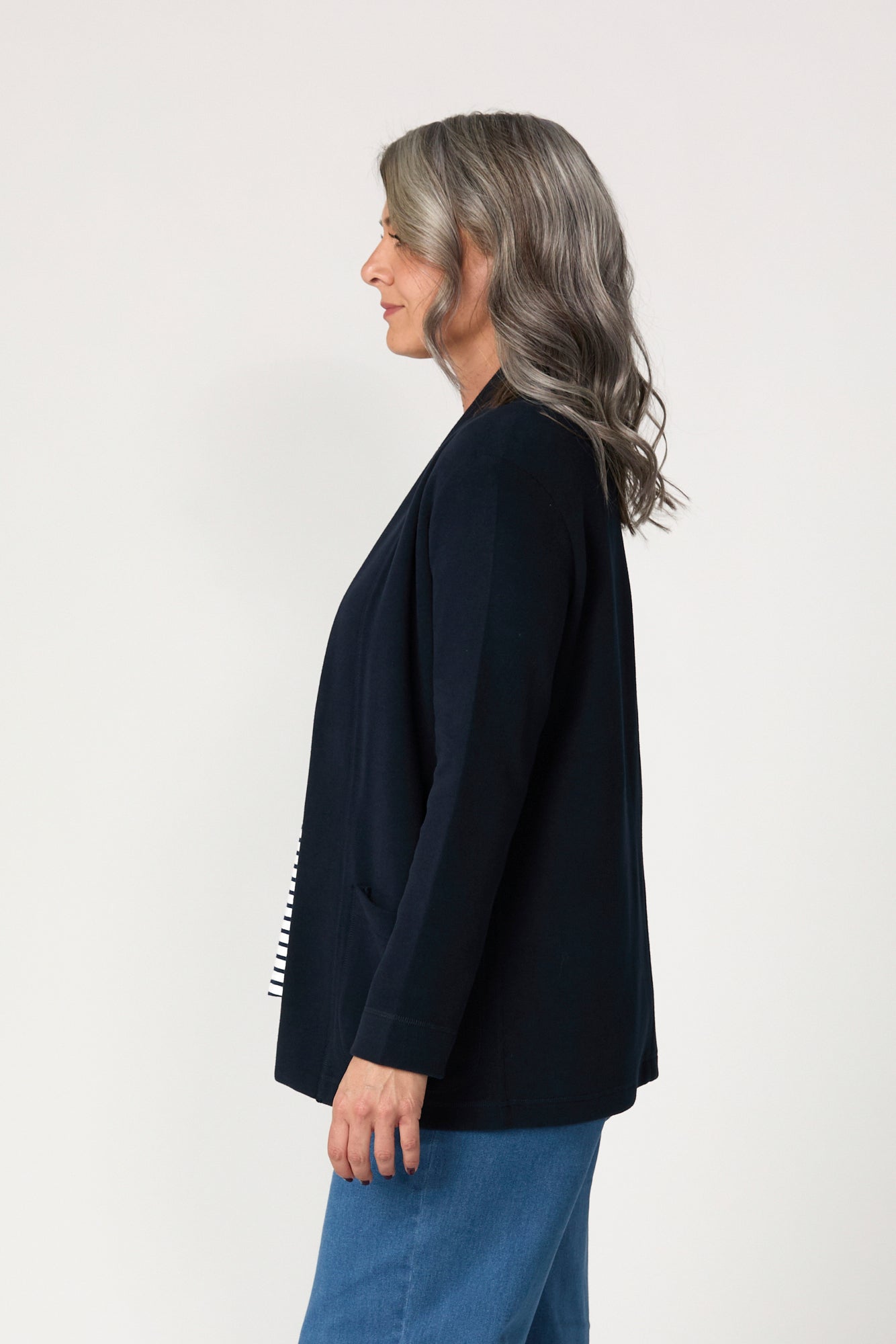 The Haven Edge To Edge Cardigan in Navy is a cardigan that delivers all-day comfort for cooler-weather layering. Long sleeves add extra coverage and make the piece useful when the weather turns cooler. Pockets keep small essentials close and reduce the need for a bag when you are on the move. The build supports easy layering, making it practical for changing temperatures and indoor-to-outdoor wear.