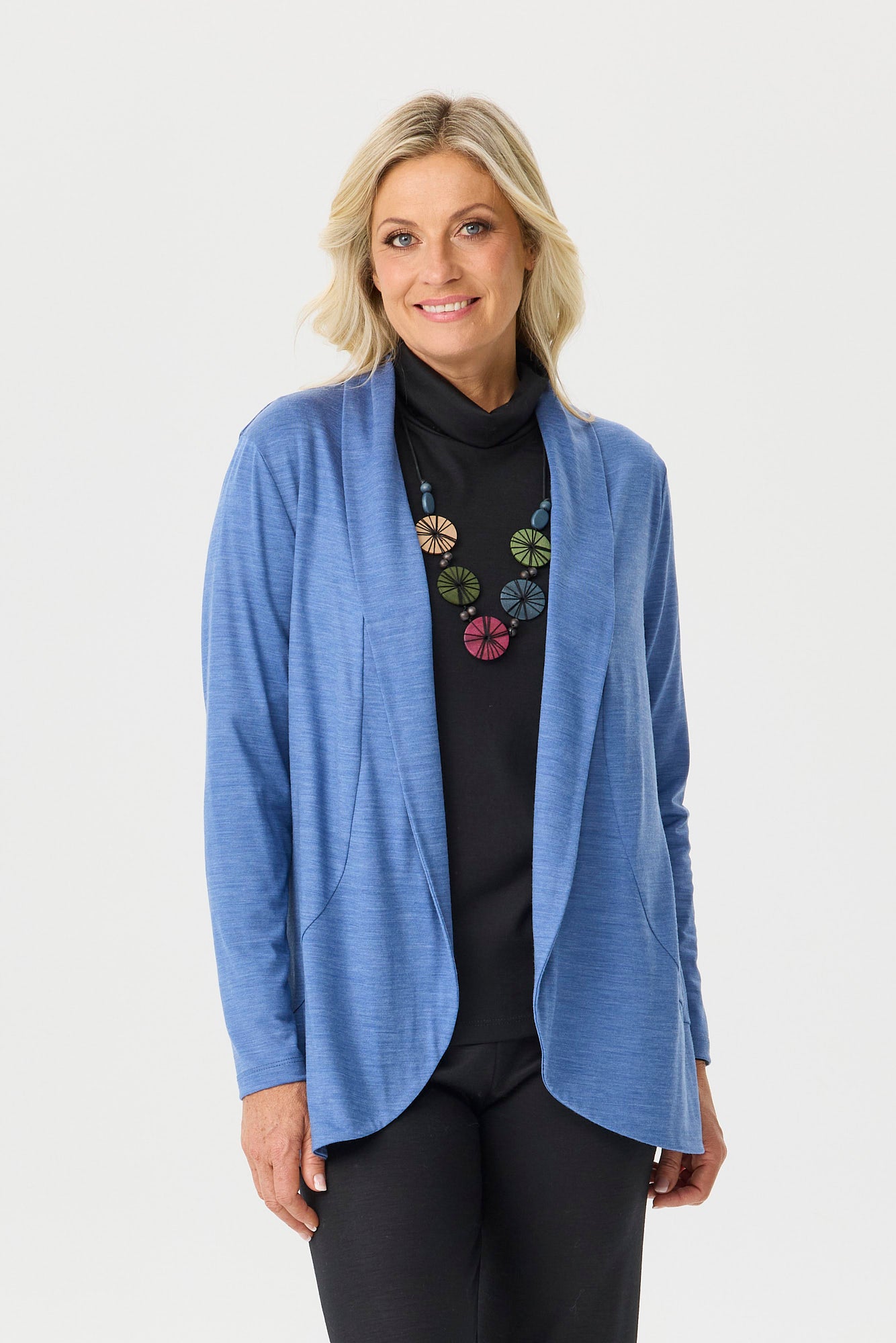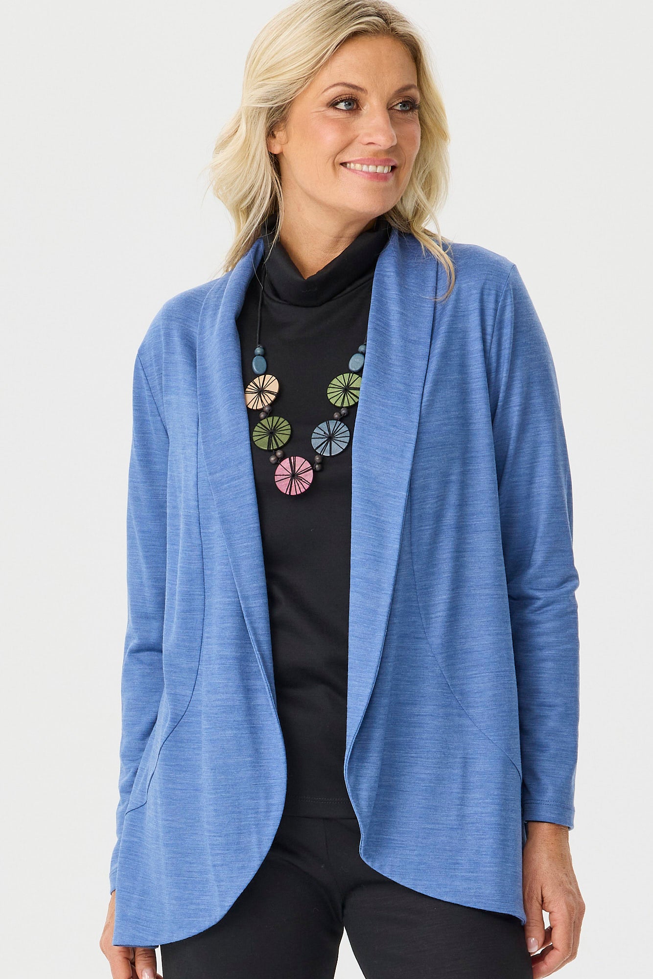 Refine your wardrobe with the Hedrena Jersey Curved Hem Cardigan in Bluestone, a beautifully contoured piece made from 100% Australian Merino Wool. Crafted locally in Australia, this soft jersey knit offers a flattering fit and timeless elegance. The shawl collar and curved front hem add a gentle flow to your silhouette, making it an ideal layering essential for cooler days.