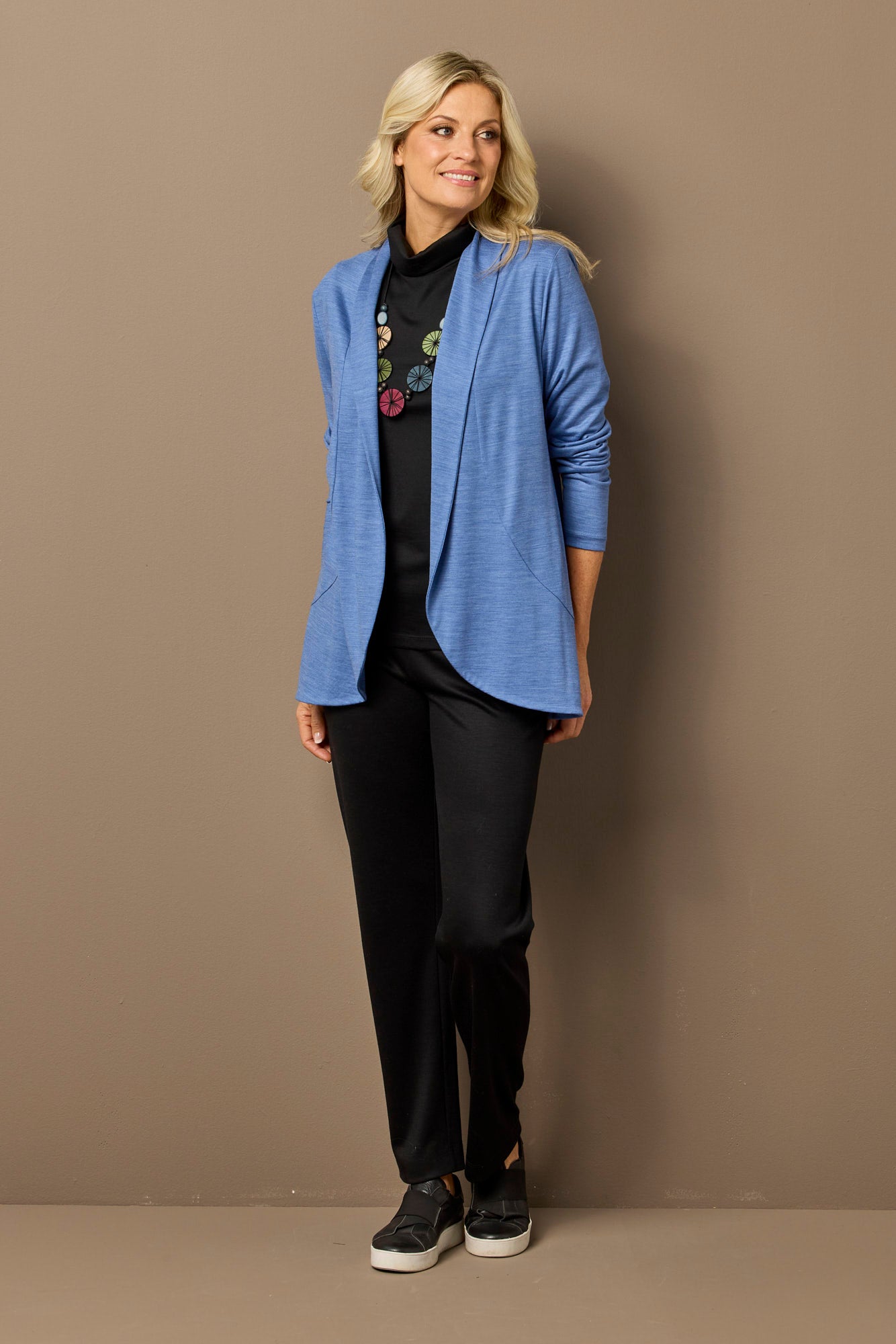 - Flattering shawl collar