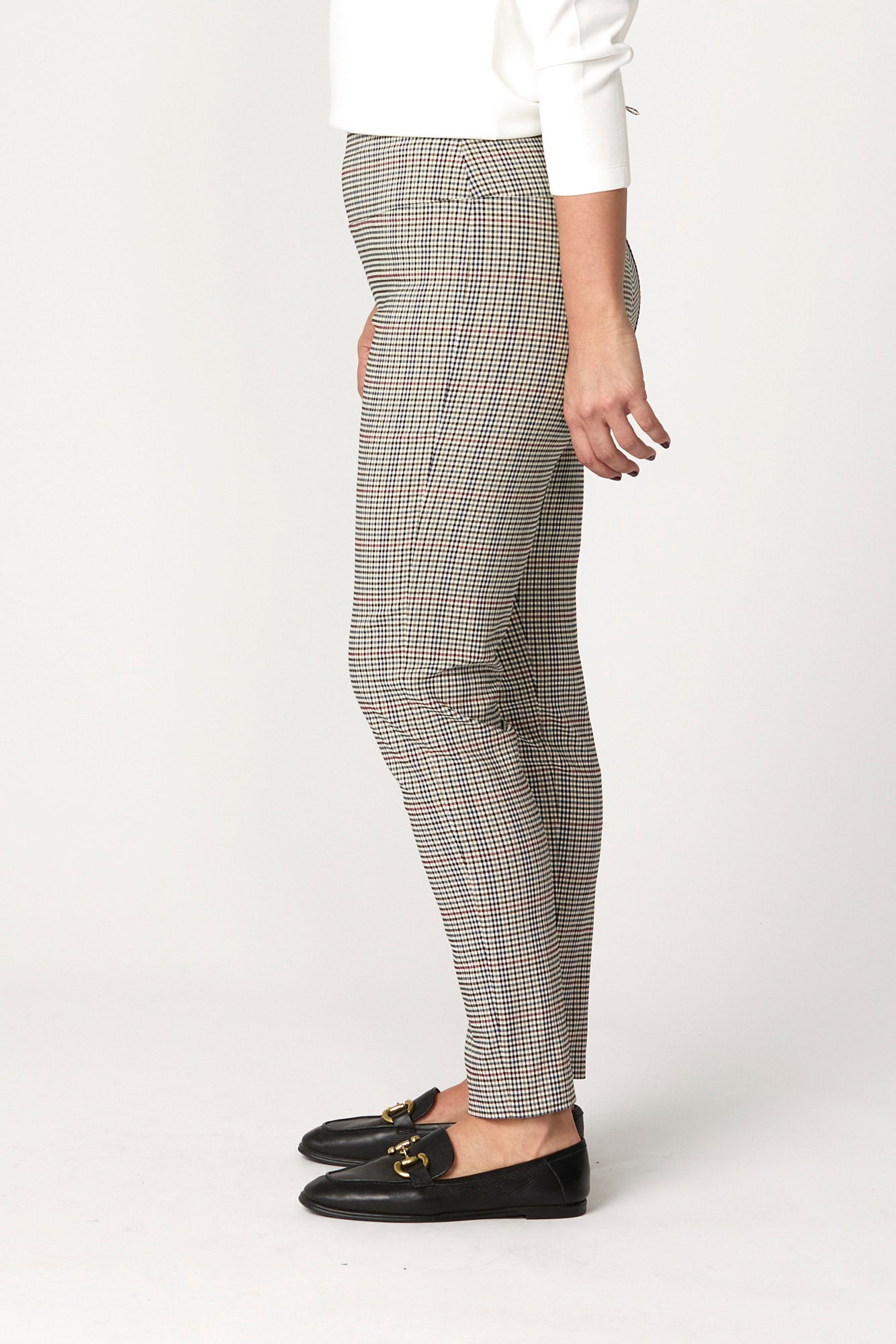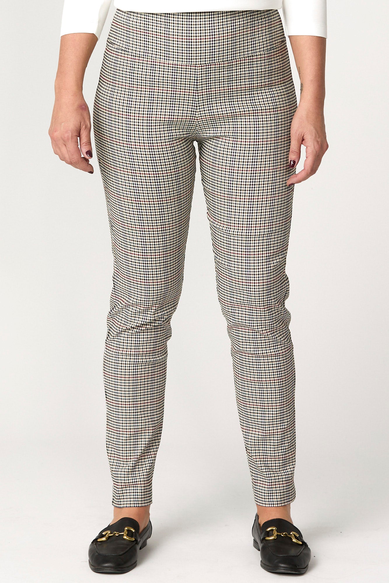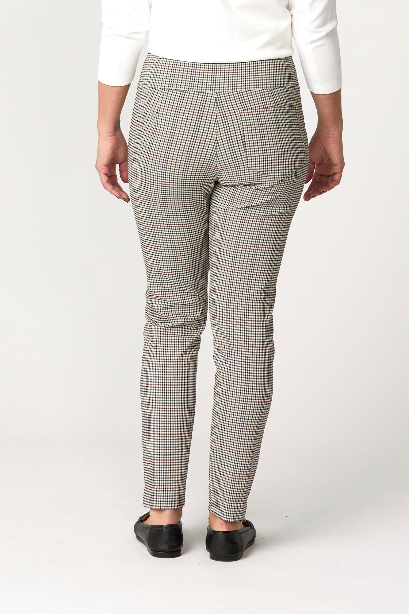 Add a refined pop of pattern to your wardrobe with the Hogan Basque Check 7/8 Pant in Multi. Designed in a tonal gingham check stretch weave, this pull-on pant offers effortless comfort and tailored polish. The straight leg cut and subtle side splits at the hem create a flattering silhouette perfect for smart-casual styling.