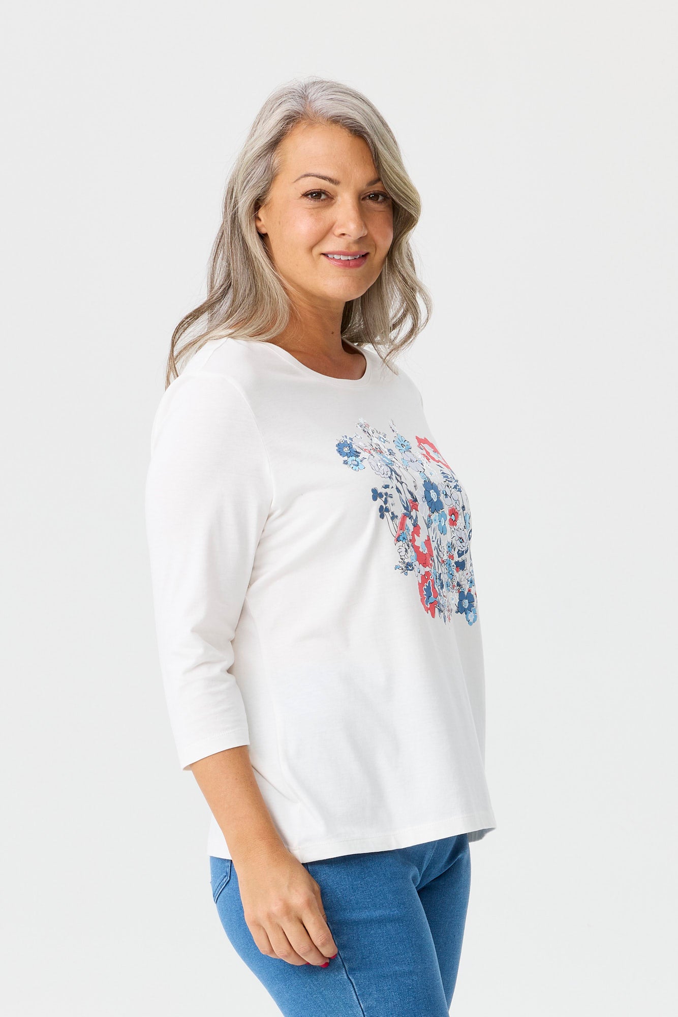 The Jerry 3/4 Sleeve Print Front Tee in White/Red Mix is a tee that delivers all-day comfort for daily routines. The fabric feels soft, keeping the tee comfortable against the skin during long wear. The round neckline offers clean coverage at the front and keeps the upper line simple for layering. 3/4 sleeves give coverage without feeling heavy, working well when you want a lighter sleeve length.