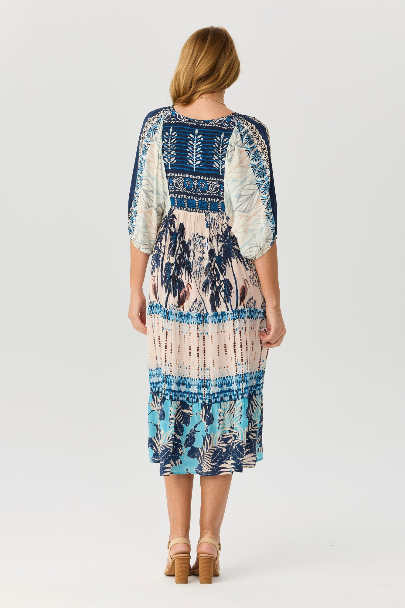Step into breezy style with the Kya Dolman Sleeve Tiered Dress in Indigo Mix. Featuring a vibrant panelled tropical print, this relaxed dress is perfect for warm-weather days. The blouson dolman sleeves and tassel neck ties add a playful touch, while tiered detailing creates graceful movement with every step.