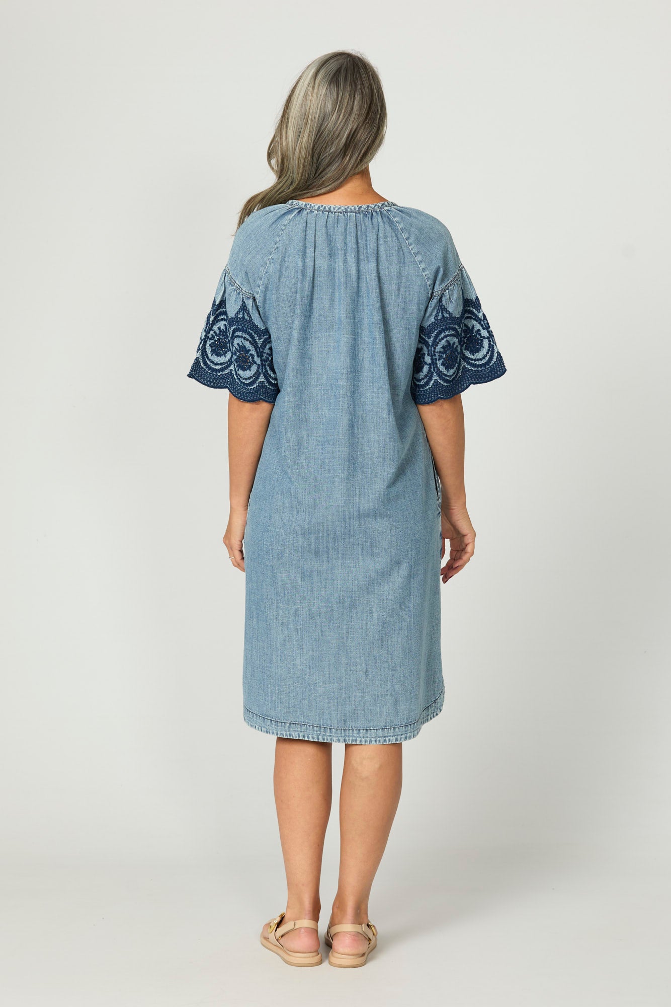 Effortlessly stylish and endlessly wearable, the Layla Denim Embroidered Dress combines relaxed comfort with refined detailing. Crafted from soft, lightweight denim, this easy-fit dress features beautifully intricate navy embroidery along the sleeves for a touch of artisanal charm. The tassel tie neckline and button-front detail add a modern boho feel, while the elbow-length sleeves and knee-length hem make it perfect for everyday wear. Pair it with sandals or sneakers for an easy off-duty look that’s both feminine and flattering.