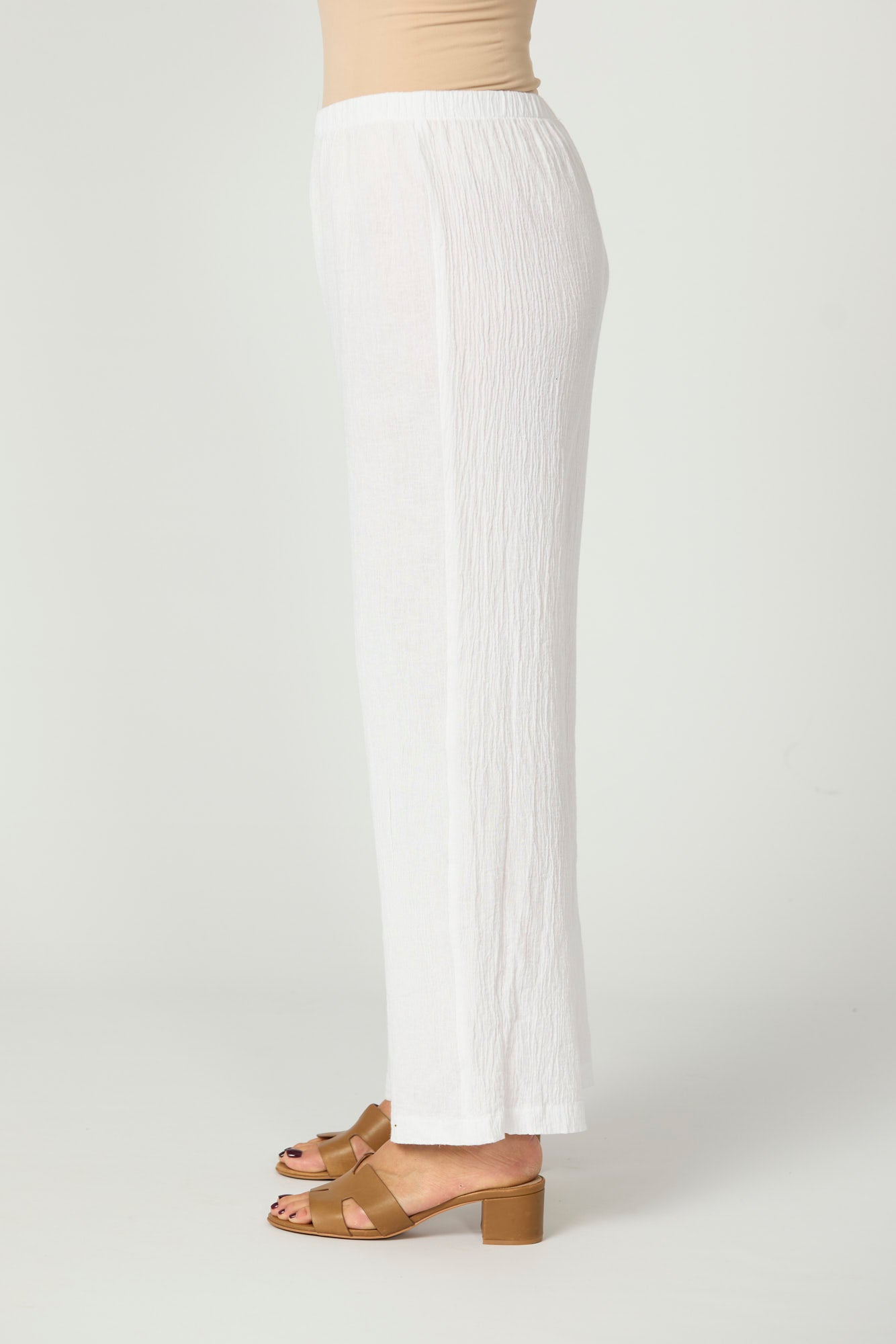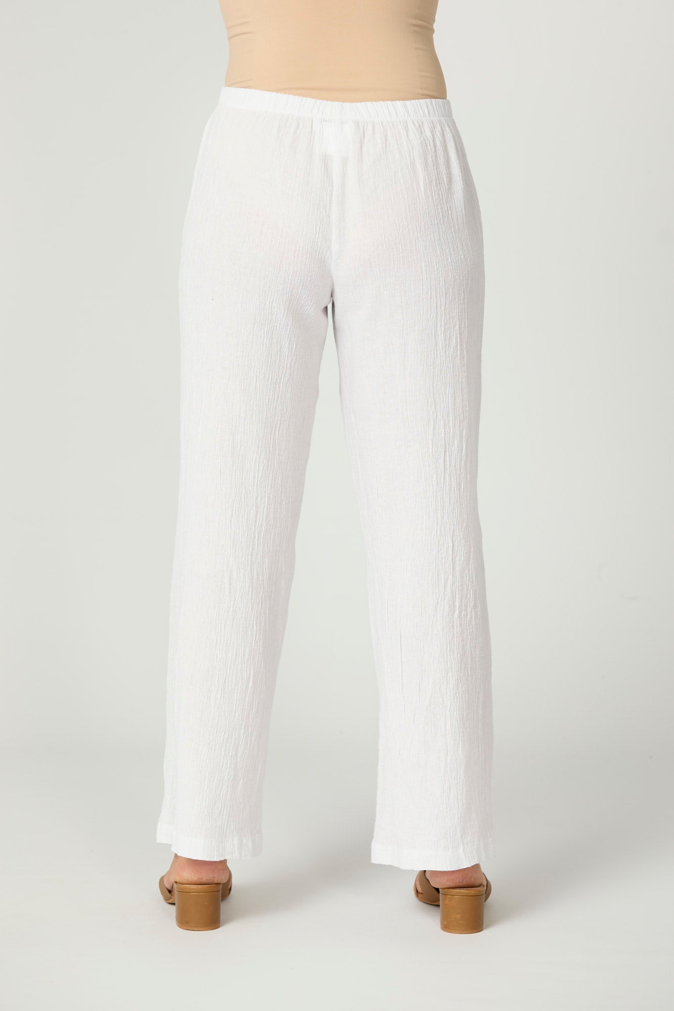 Step into comfort and sophistication with the Lumina Wide Leg Pull On Pant in White. Made in Australia, these pants feature a lightweight textured fabric and an easy pull-on design. The wide-leg silhouette offers flow and ease, while the elasticated waist and inner side pockets ensure all-day wearability.