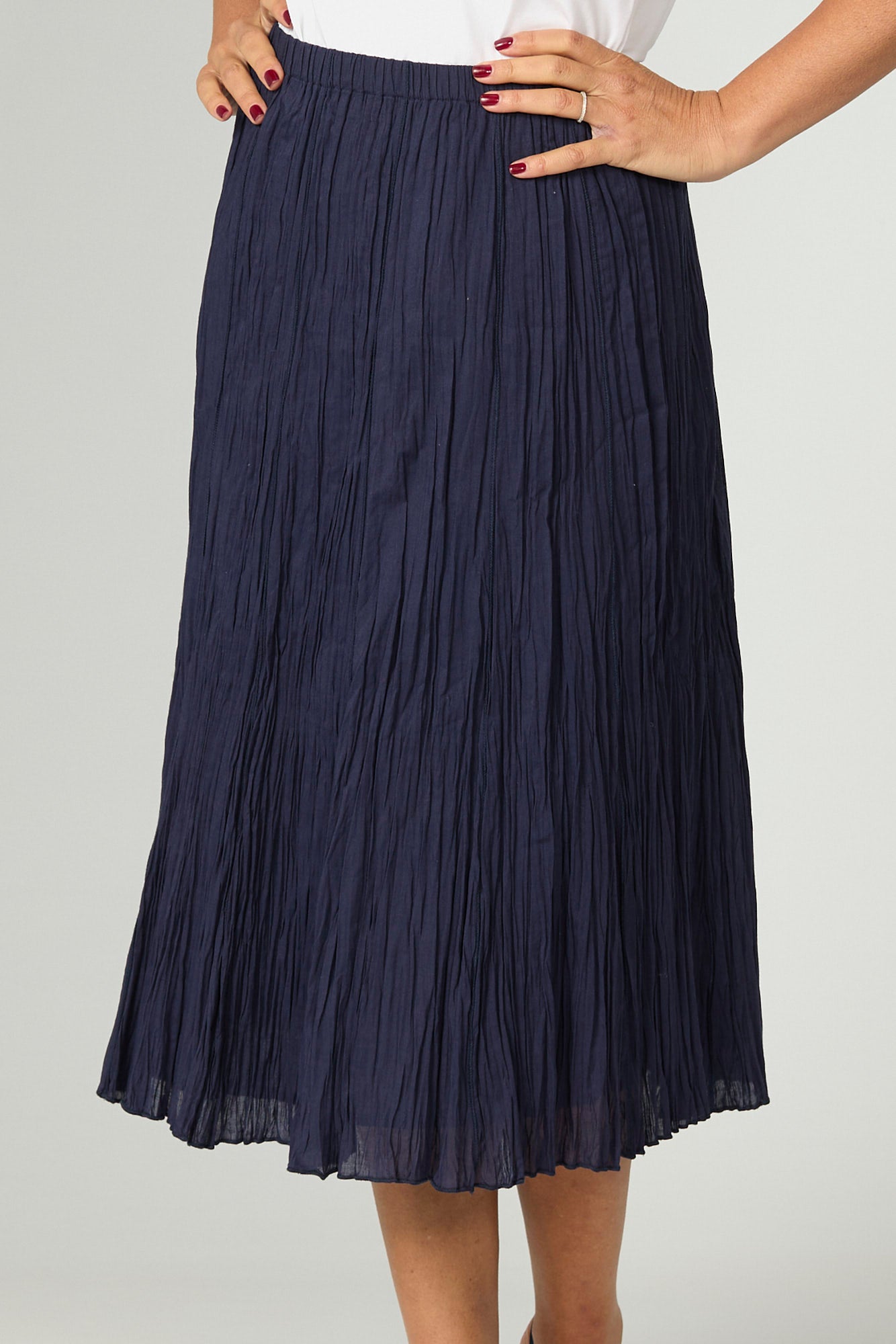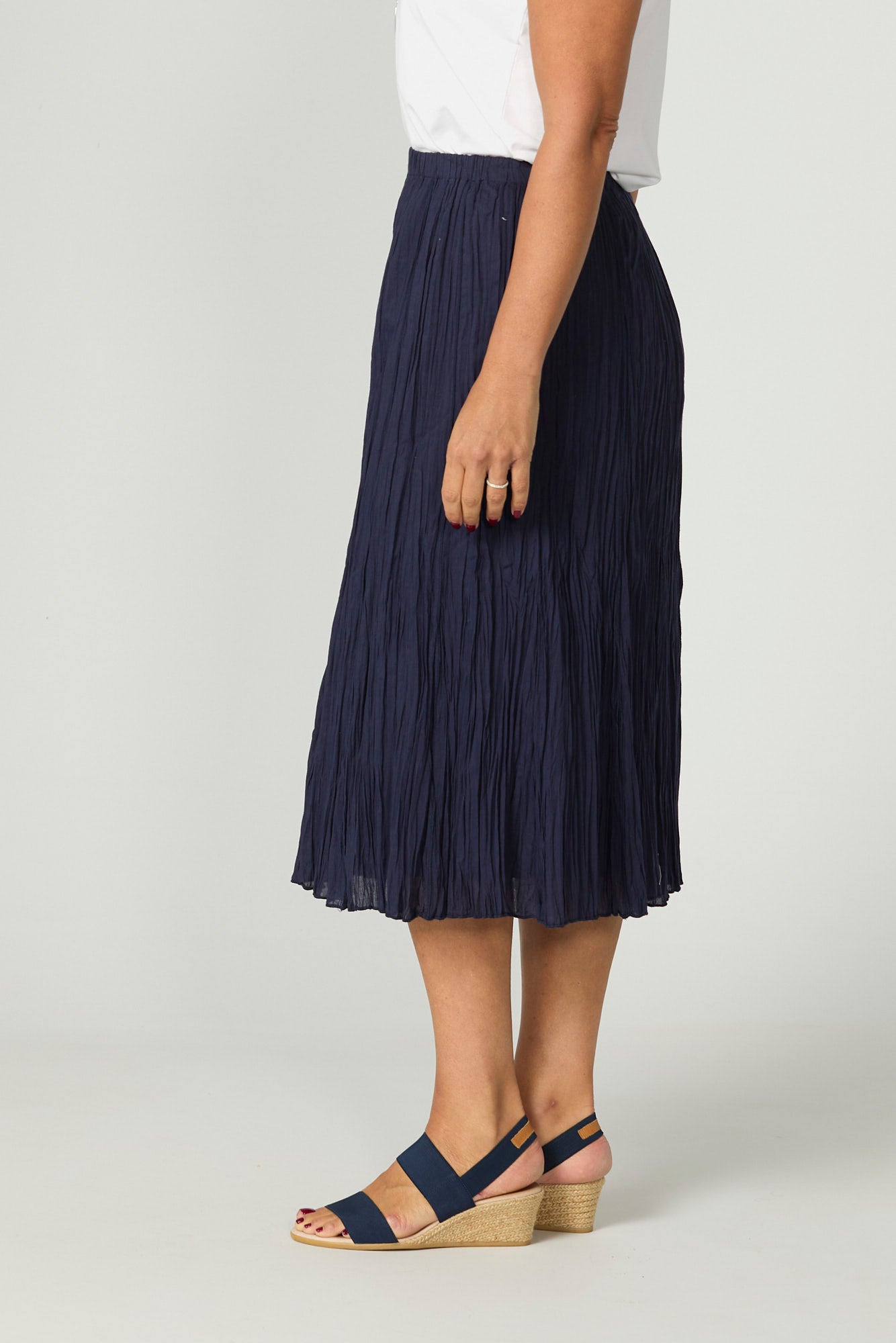 Effortlessly chic and endlessly versatile, the Maya Crinkle Skirt in Navy is a timeless piece designed for easy, everyday wear. Crafted from lightweight 100% polyester, its soft crinkle texture adds dimension and movement while keeping maintenance simple—no ironing needed.