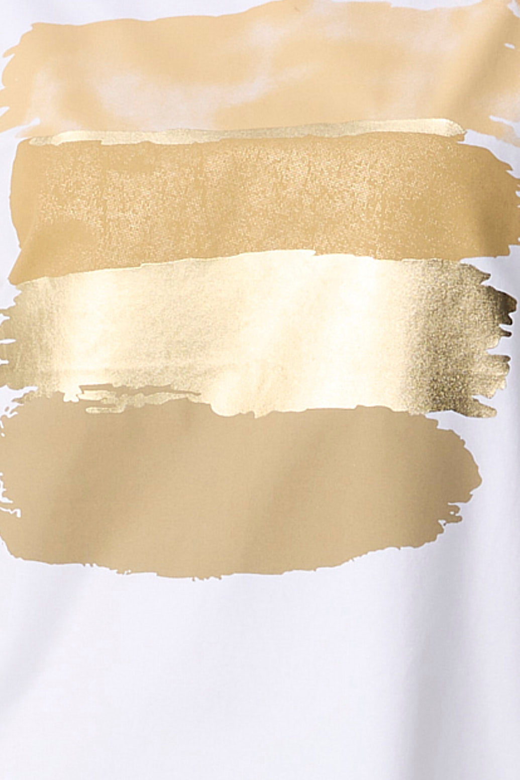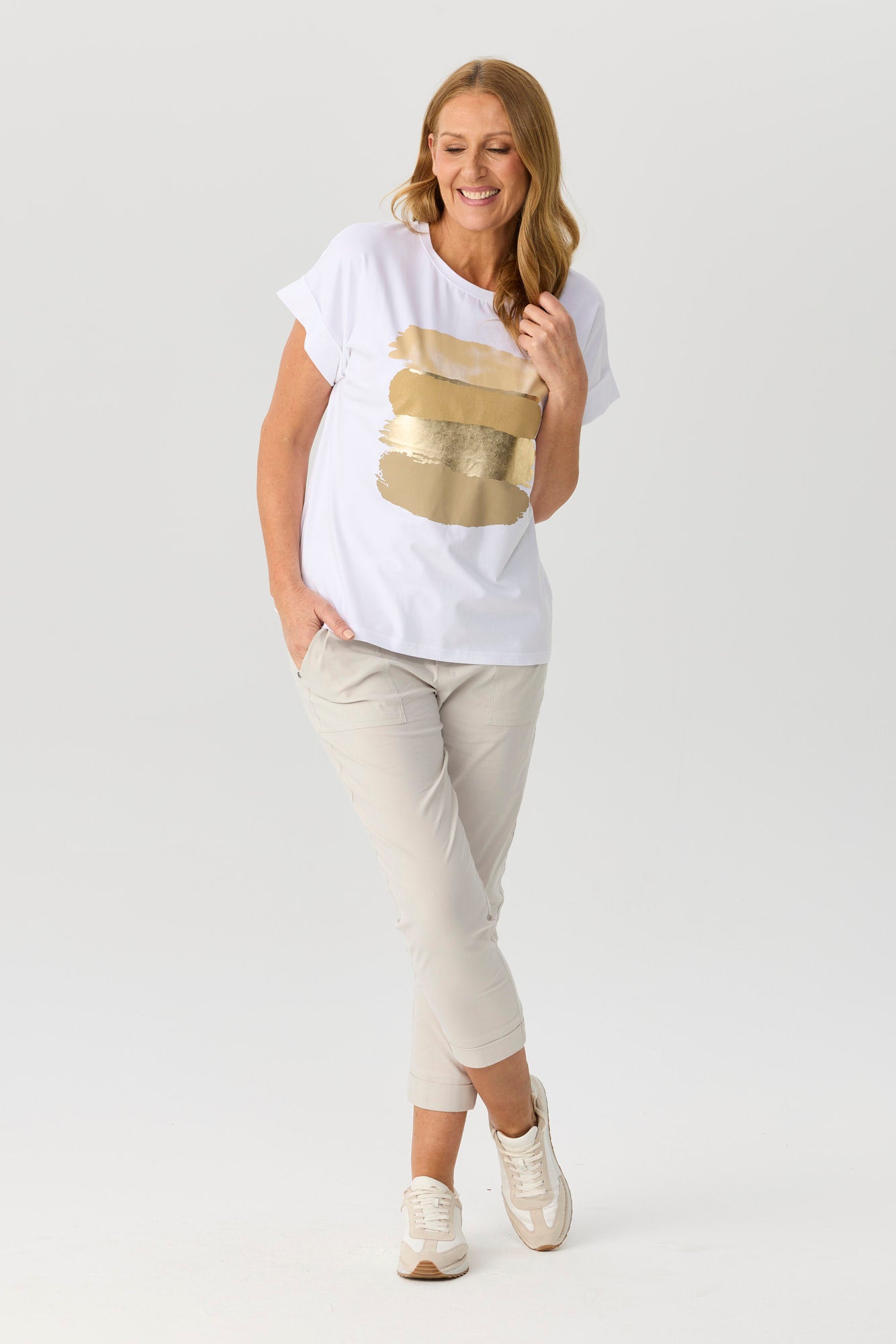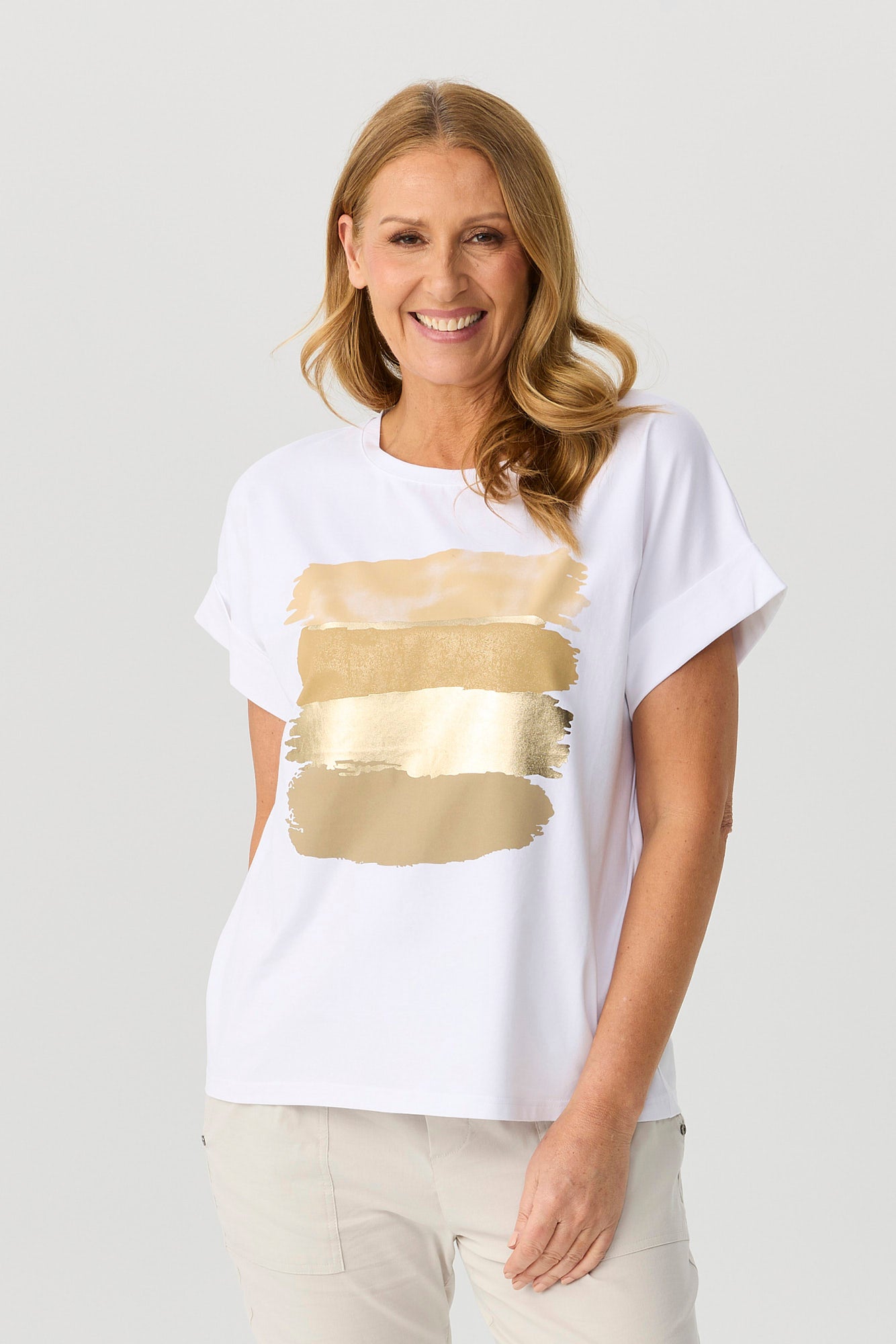 Shine effortlessly in the Miami Relaxed Short Sleeve Tee in White and Gold. Featuring a striking metallic foil print on the front, this tee adds a touch of glamour to casual dressing. The relaxed drop shoulder design and wide cuffed sleeves enhance its laid-back yet polished appeal.