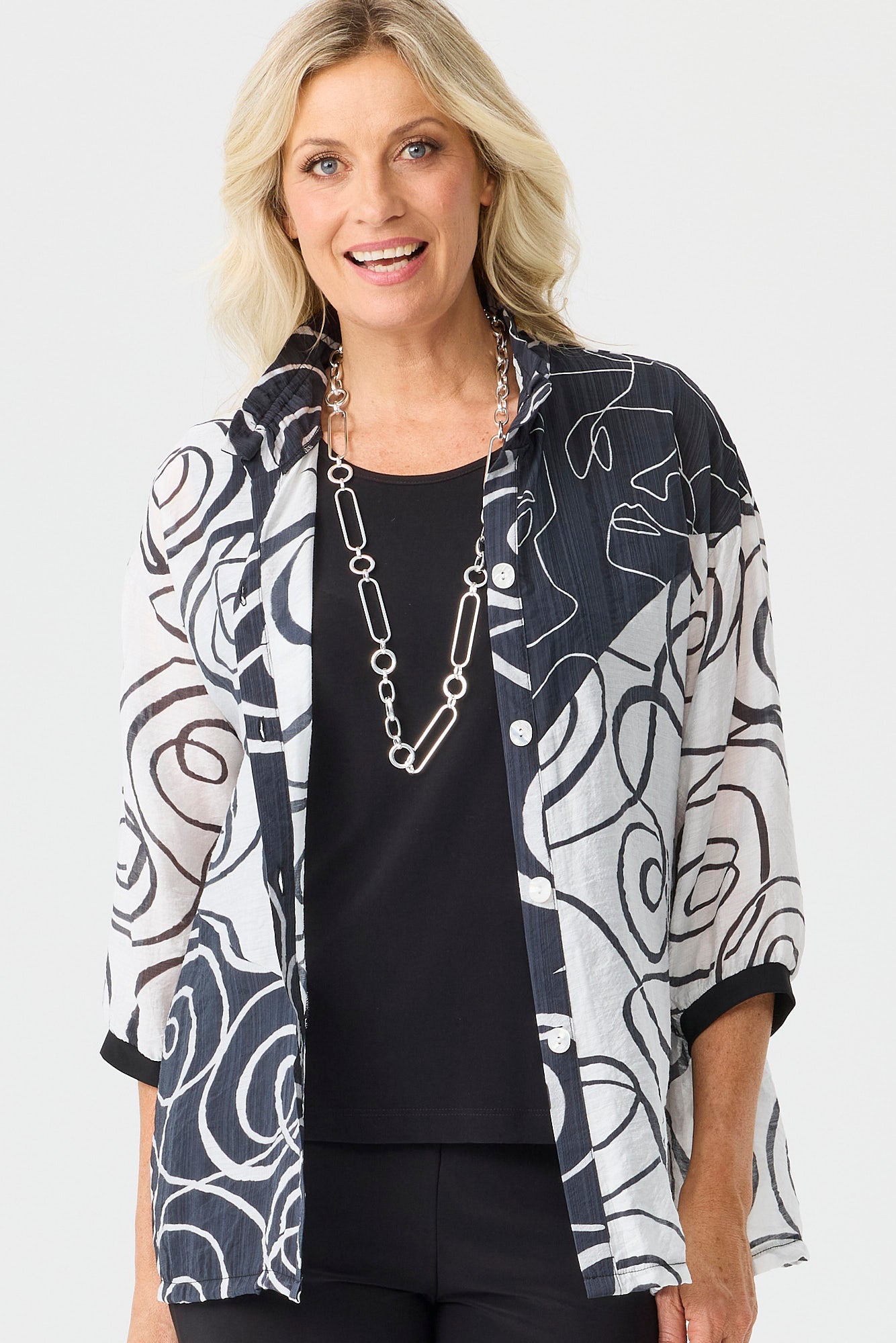 The Mondo 3/4 Sleeve Shirt in White/Black is a shirt that delivers all-day comfort for daily routines. 3/4 sleeves give coverage without feeling heavy, working well when you want a lighter sleeve length. The print detail adds visual interest while keeping the overall shape easy to style. Adjustable elements allow a secure, personal fit and help the piece stay comfortable through long wear.