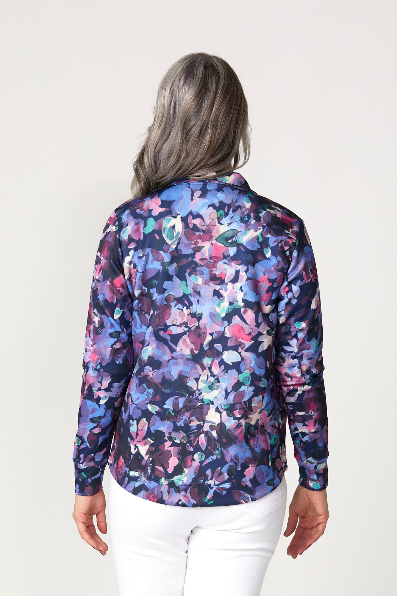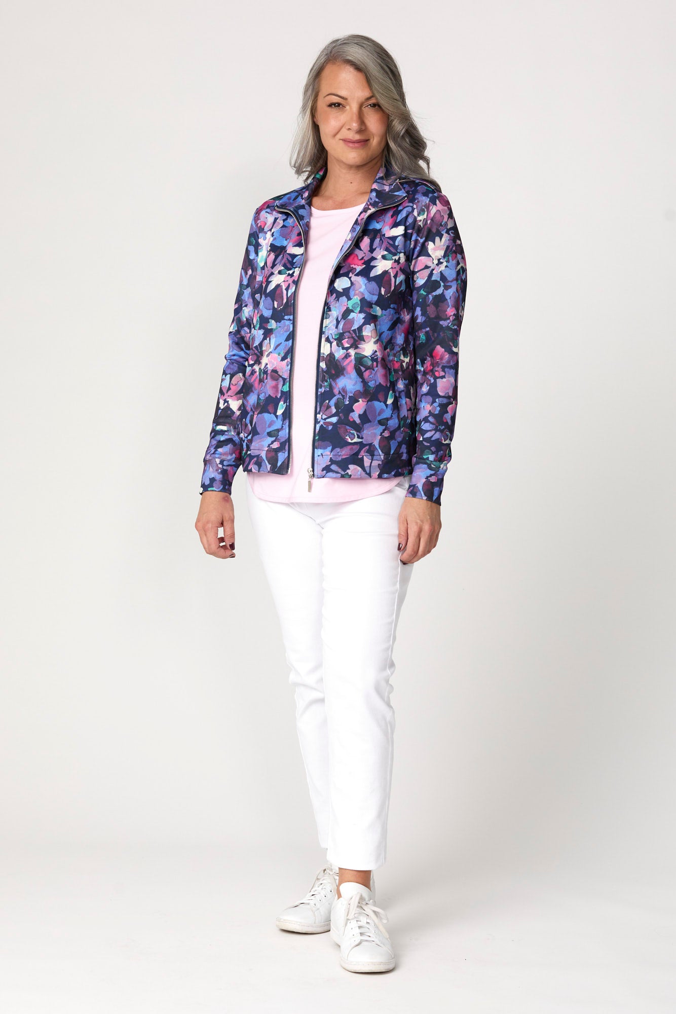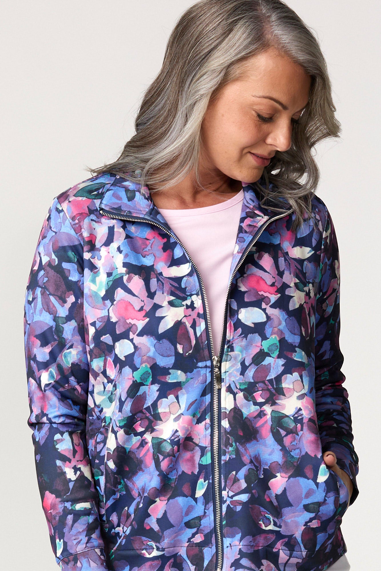 Make a bold statement with the Oasis Print Zip-Up Jacket in Abstract Navy. Showcasing a vibrant botanical print, this jacket offers both warmth and style. Designed with a metallic front zipper and stand collar, it combines modern flair with functional comfort. The ultra-soft brushed interlock fabric keeps you cosy, while details like front side inner pockets, a curved back hem, and contrast herringbone zipper tape add a fashionable touch.
