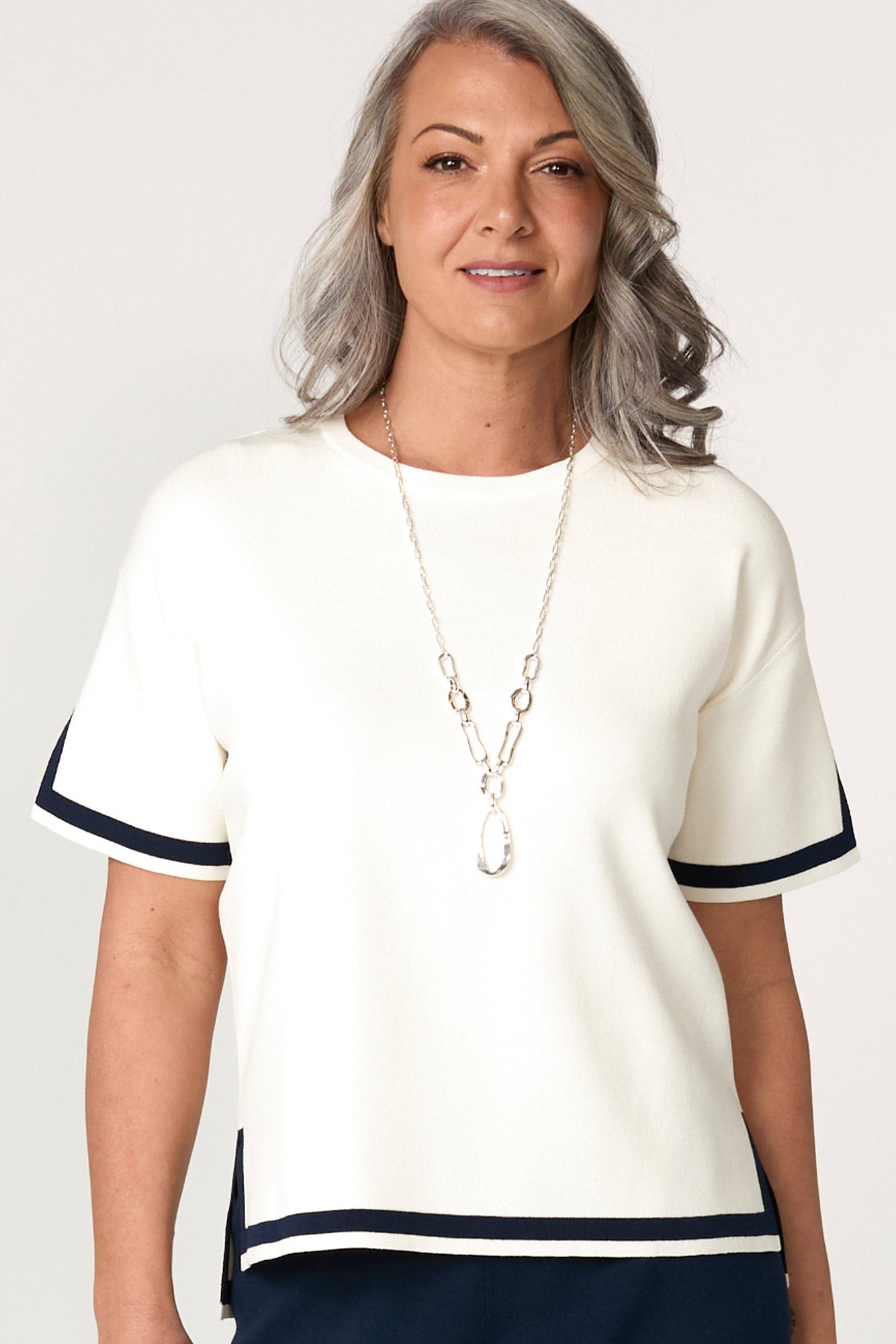 Strike the perfect balance between comfort and polish with the Otis Contrast Trim Short Sleeve Knit Tee in Ivory/Navy. This elevated everyday piece features a relaxed drop shoulder fit, finished with bold contrast stripes and subtle side splits for modern movement. A hi-lo hem adds a flattering touch to this effortlessly chic design.