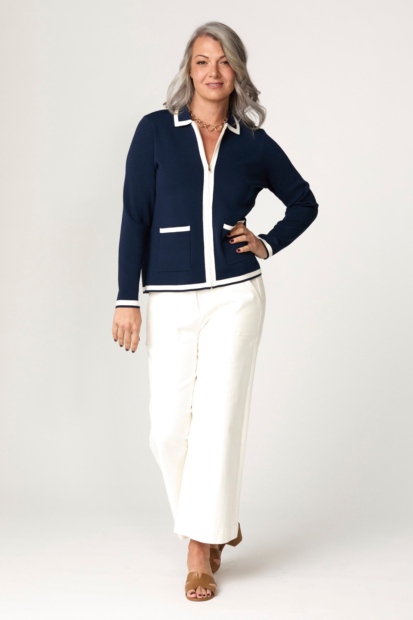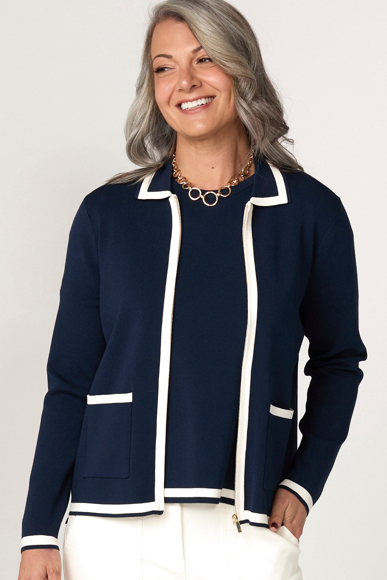 Bring refined comfort to your layers with the Otis Contrast Trim Zip Cardi in Navy/Ivory. Designed with a modern hi-lo hem and subtle side splits, this zip-up cardigan combines elegance and ease. The fine rib knit offers texture, while contrast stripes and ribbed tubular trims add polished detail to a classic silhouette.
