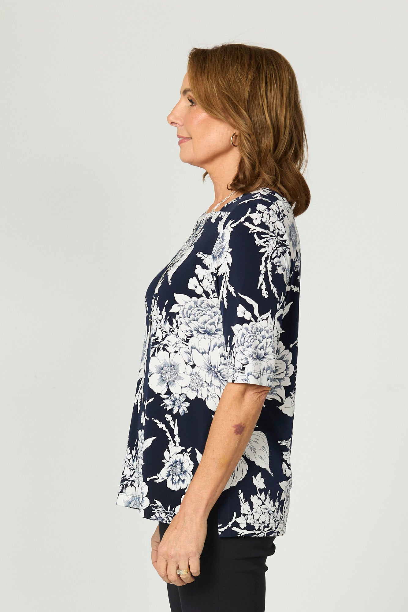 Step into timeless elegance with the Panache Elbow Sleeve Square Neck Top in Navy/White. Proudly made in Australia, this top showcases a romantic monochrome floral print enriched with raised puff detailing. The square neckline adds a touch of sophistication, while elbow-length sleeves and side hem splits ensure comfort and grace in every wear.