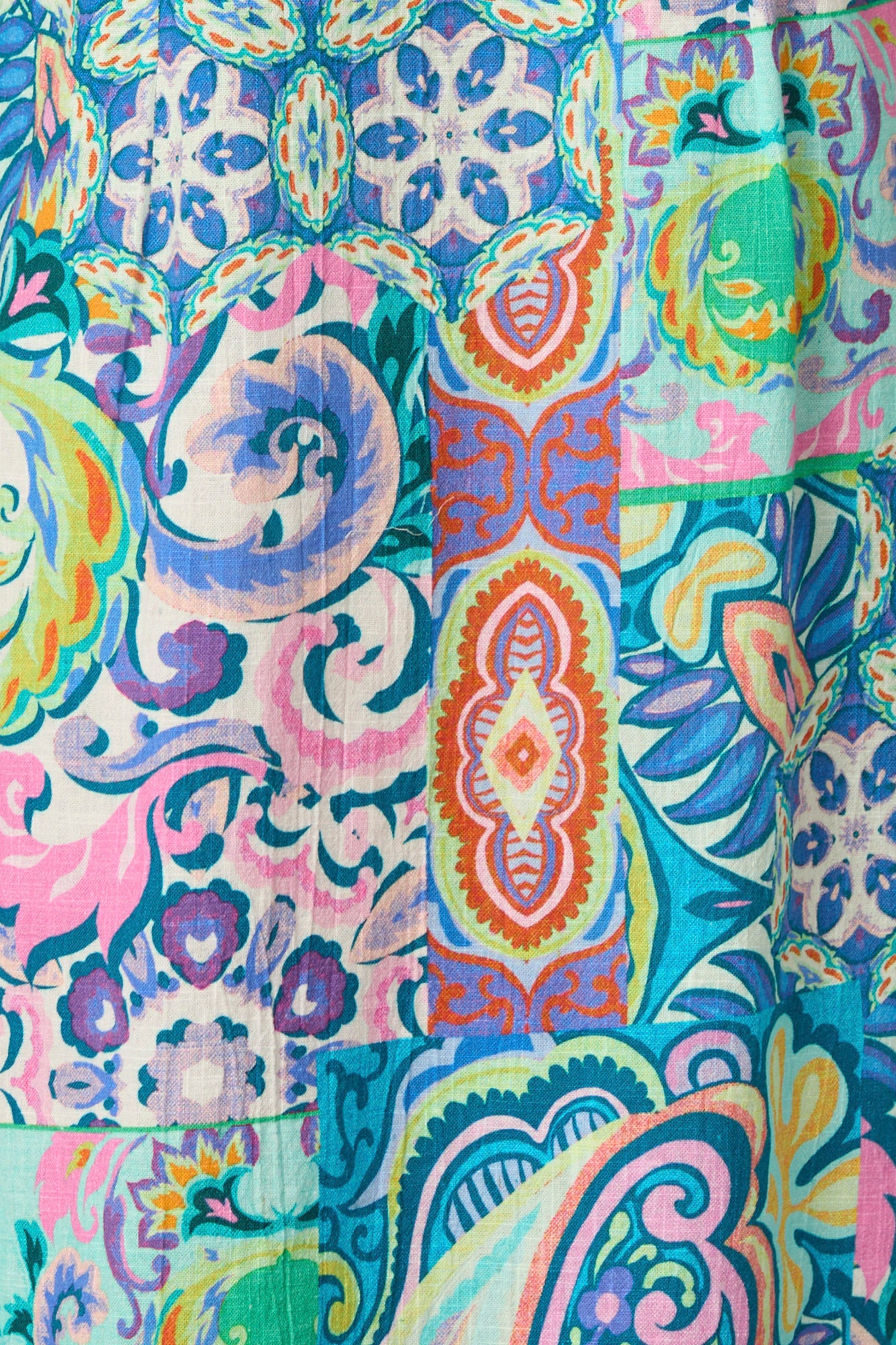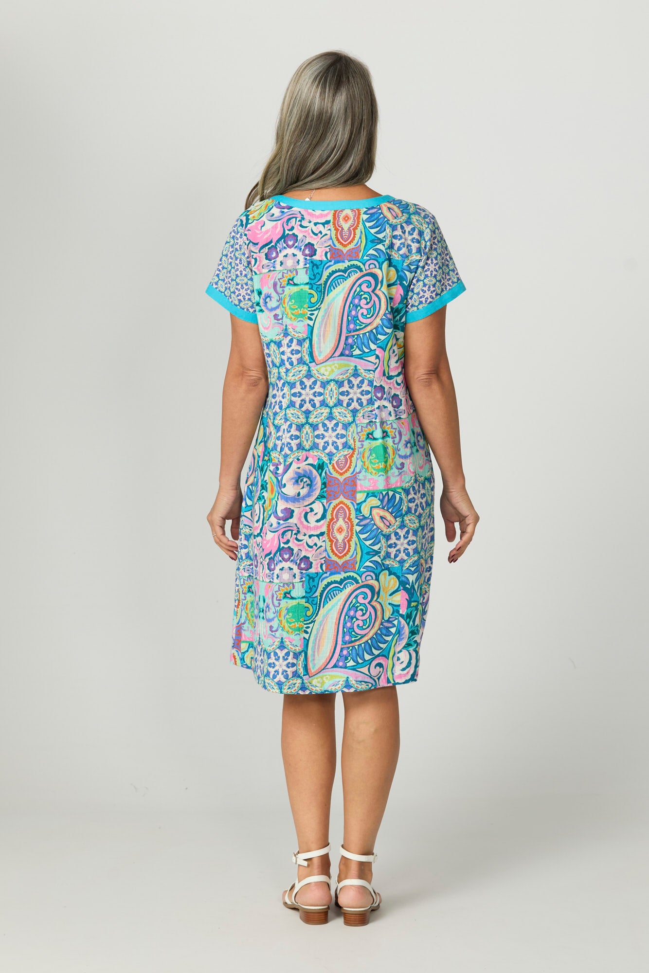 Add a touch of artistic flair to your wardrobe with the Patch Pocket Shift Dress in Brights Multi. Made from 100% cotton, this colourful dress features a bold 60’s-inspired patchwork print with eye-catching contrast binding. Embroidered stitch detailing adds texture, while its comfortable shift silhouette and short sleeves make it a vibrant choice for everyday wear.