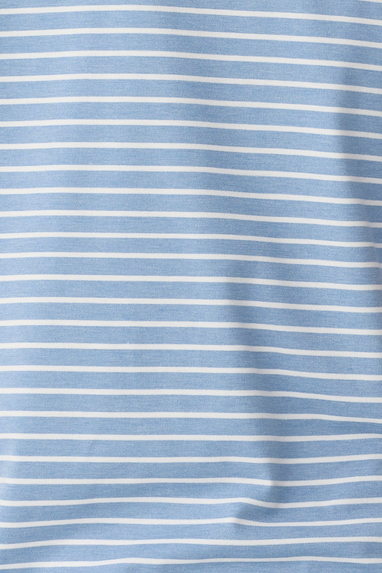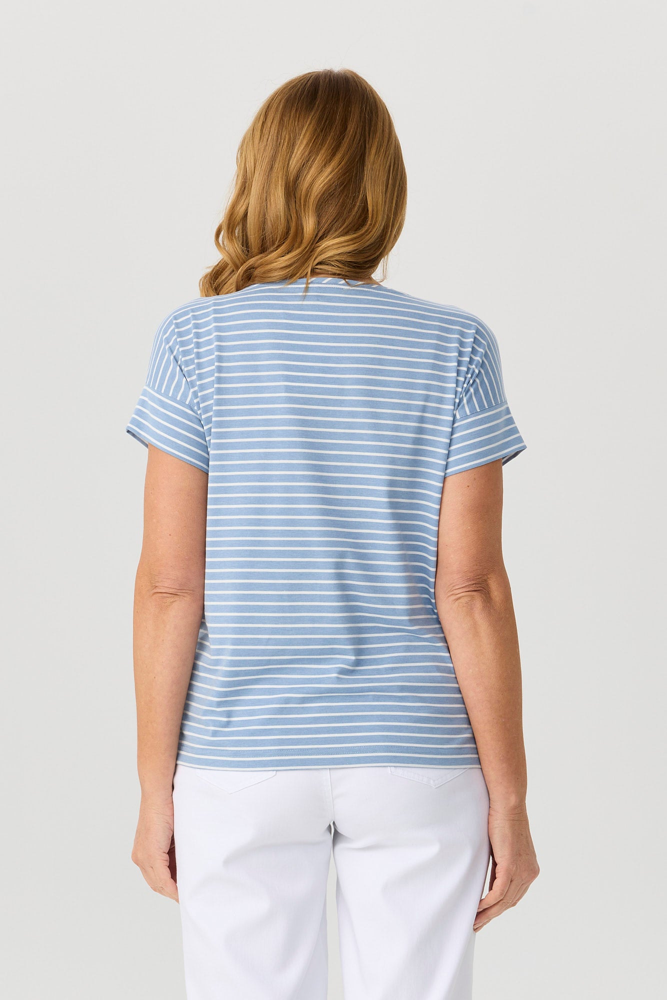 Add a touch of relaxed polish with the Pebble Stripe Short Sleeve Tee in Chambray. Designed with a regular stripe pattern and modern drop shoulder sleeve, this tee brings effortless style to your everyday look. The wide contrast binding on the sleeves and neckline adds a contemporary edge, while side hem splits ensure easy movement.