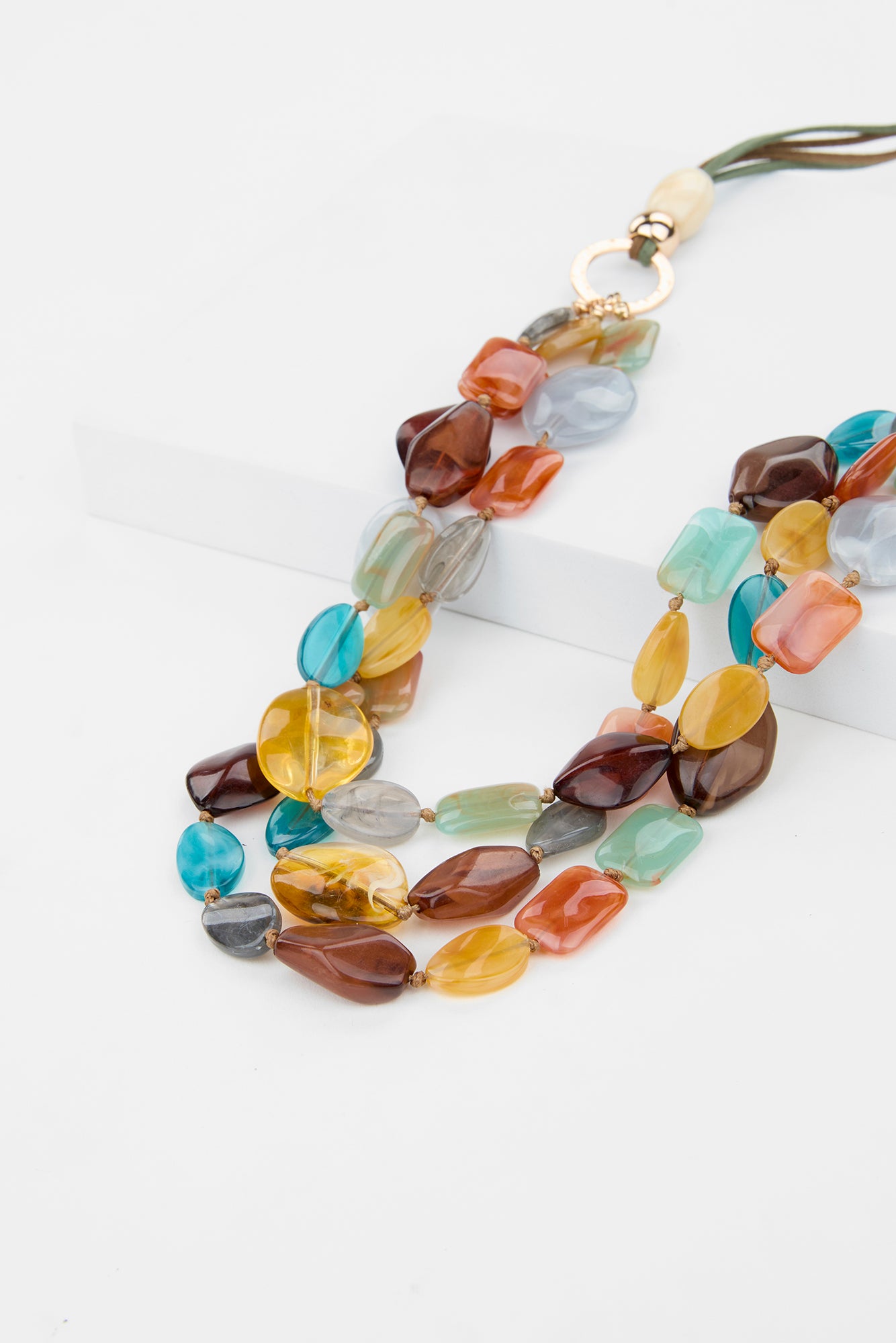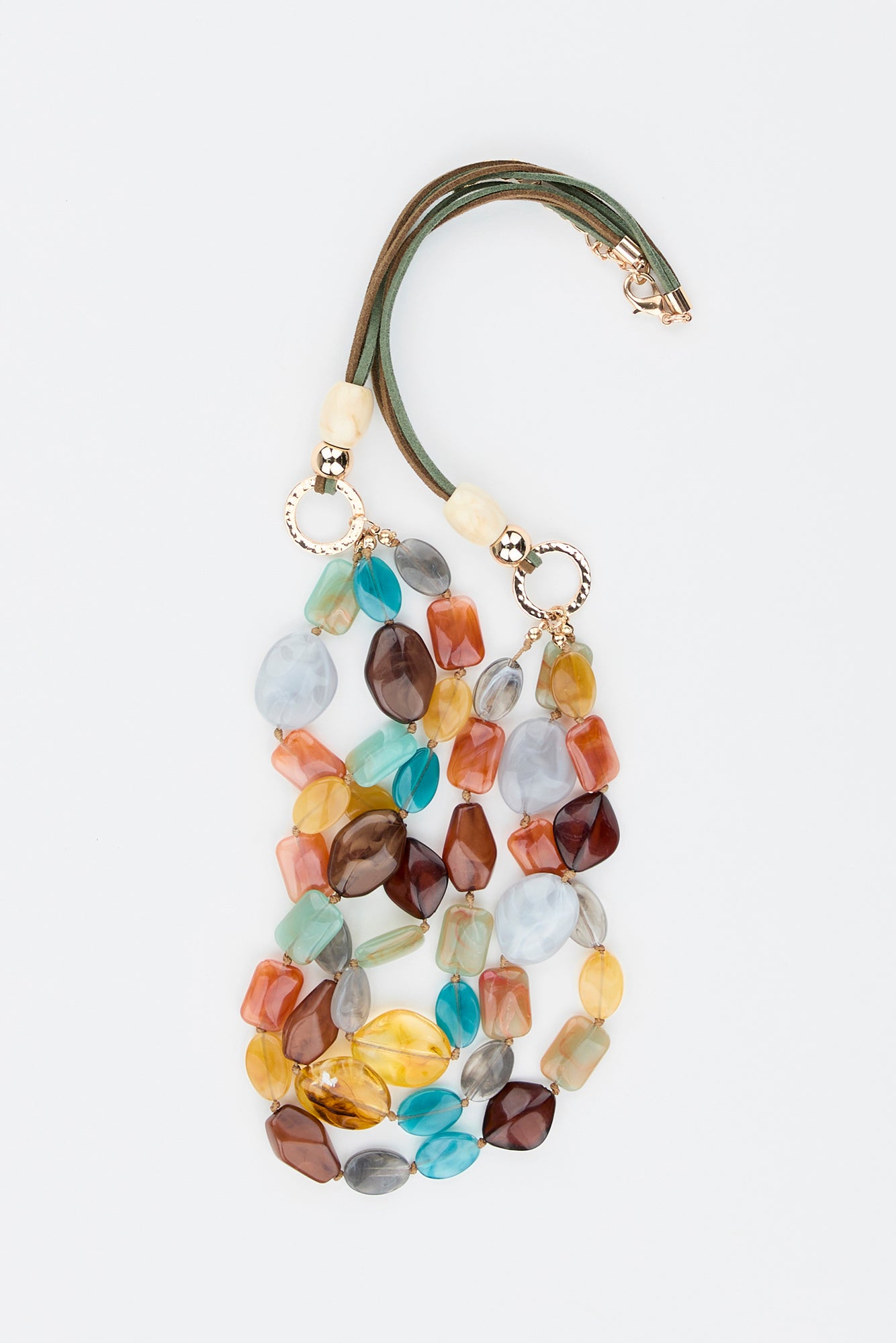 Turn heads with the vibrant charm of the Samira Multi Strand Necklace in Multi. Featuring three strands of bold, translucent beads in a rainbow of earthy tones, this eye-catching piece adds texture and colour to any outfit. Finished with gold-tone hardware and an adjustable clasp for a perfect fit.