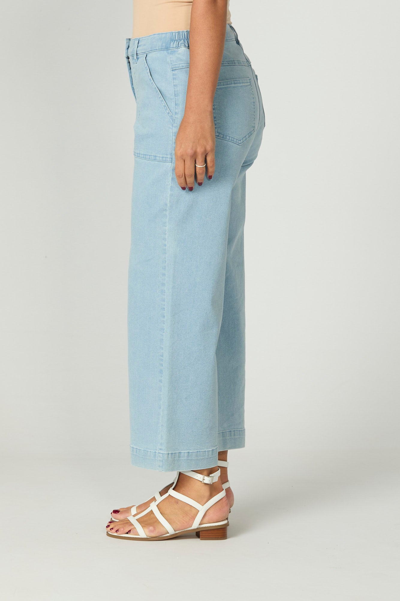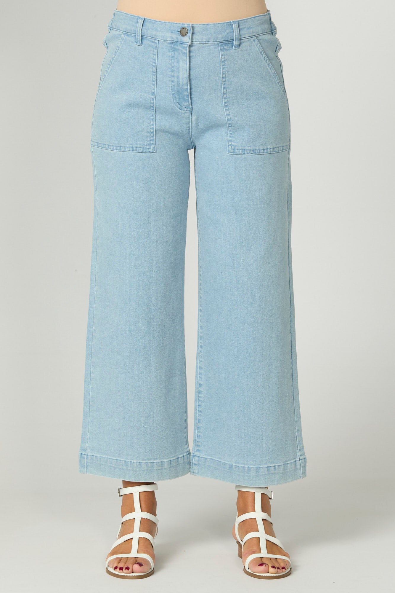 Elevate your everyday denim with the Shelby Patch Pocket Zip Jean in Chambray. Designed for comfort and style, this wide-leg jean features a front shank button and zip closure with side elastic panels for a flexible fit. The patch pockets and topstitch detailing add a modern edge, making it a chic staple for any wardrobe.