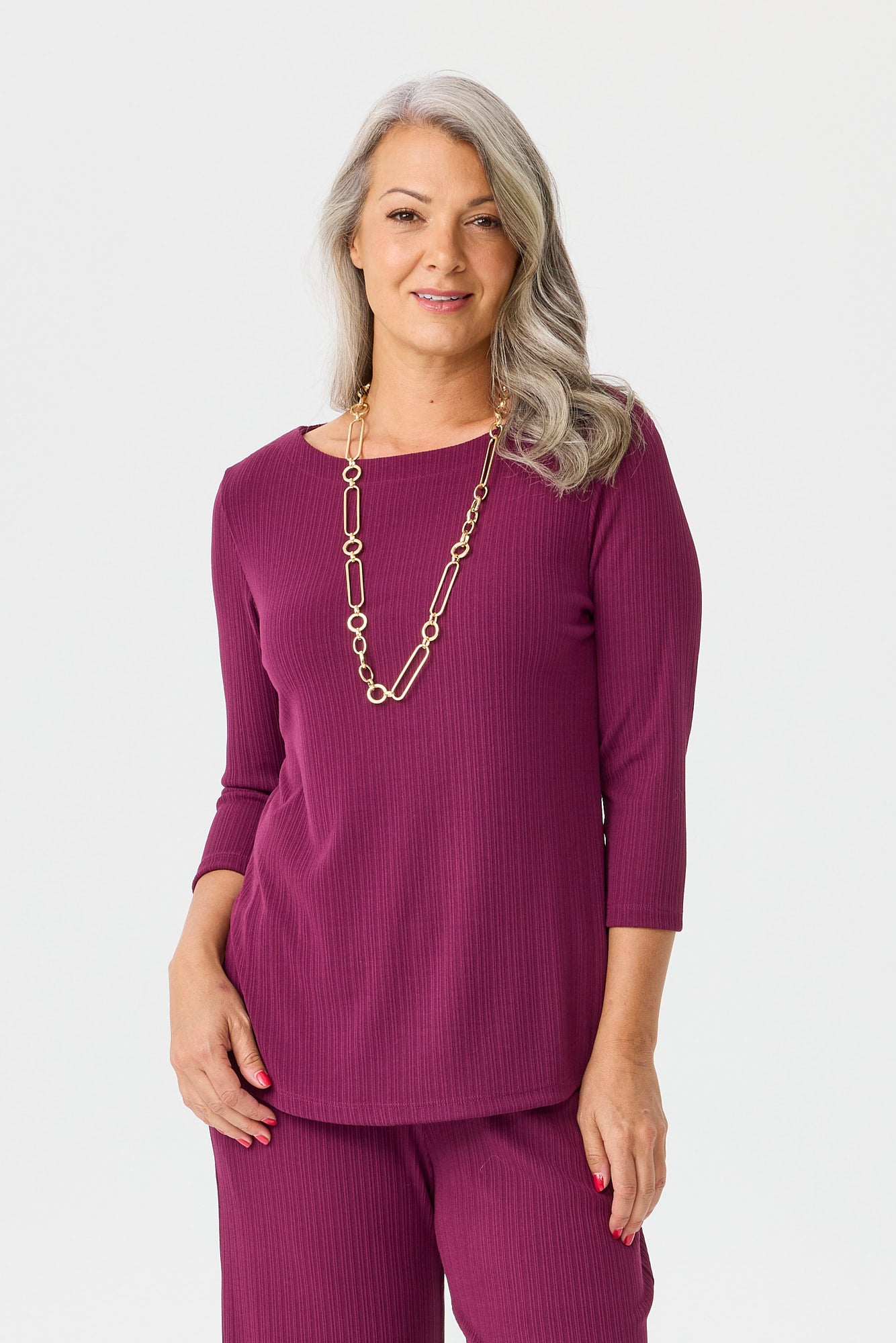 Refresh your wardrobe with the effortless style of the Tempest Relaxed Slash Neck Top in Bordeaux. Made in Australia, this top is crafted from a textured rib knit fabrication, offering a perfect balance of structure and stretch for everyday comfort. The wide boat neckline adds a touch of elegance, while the 3/4 sleeves and side hem splits provide a relaxed and flattering fit. A versatile staple for any season.