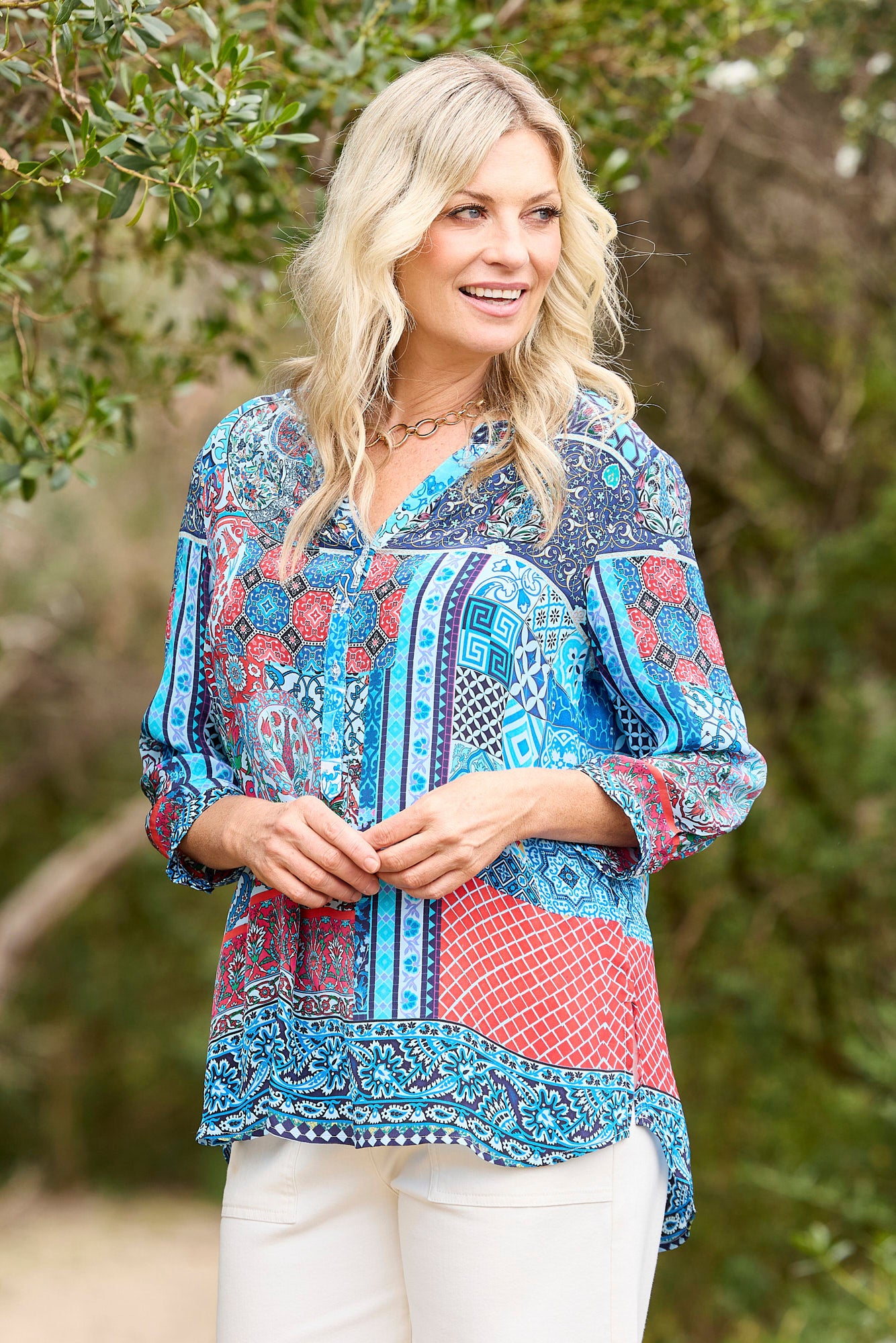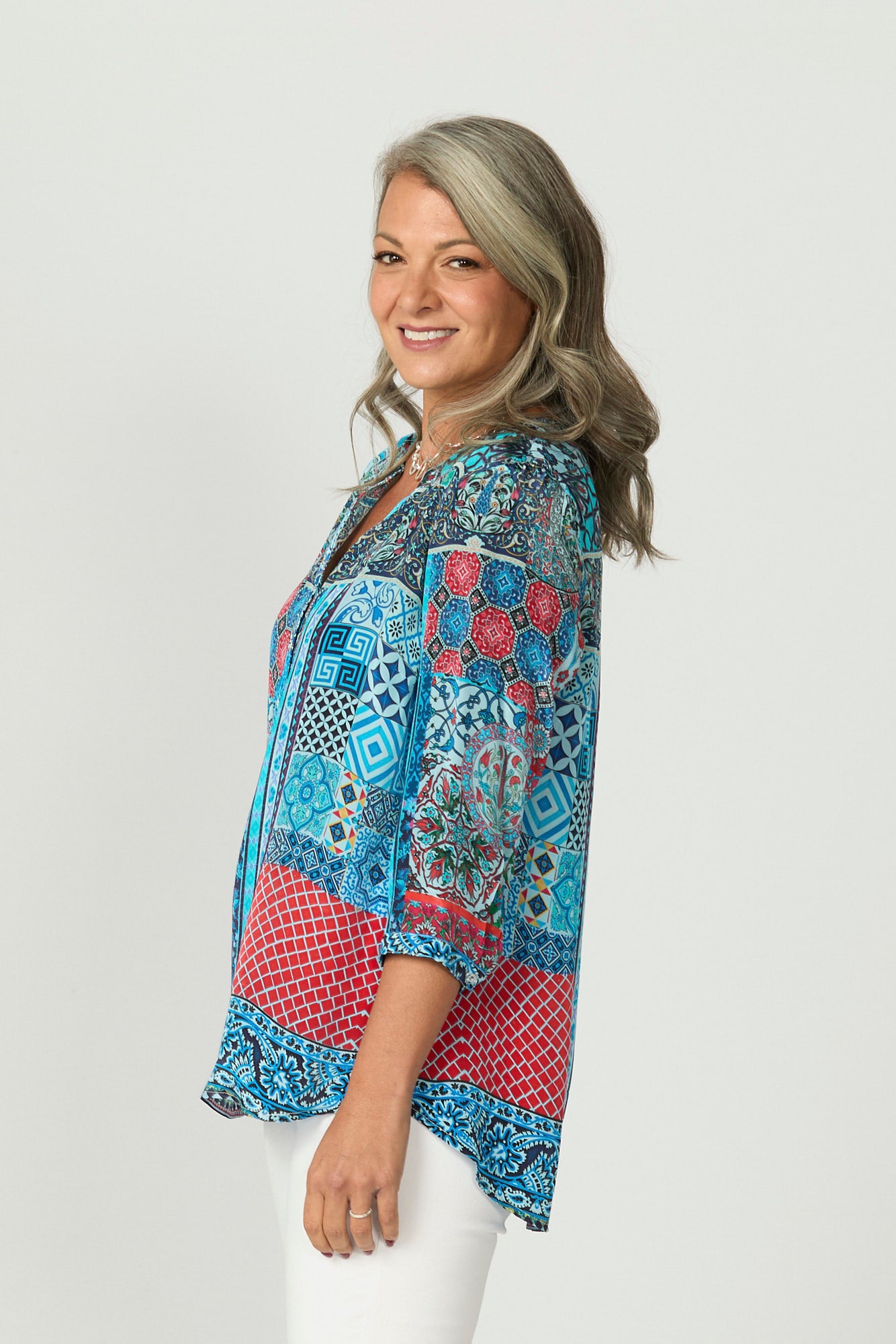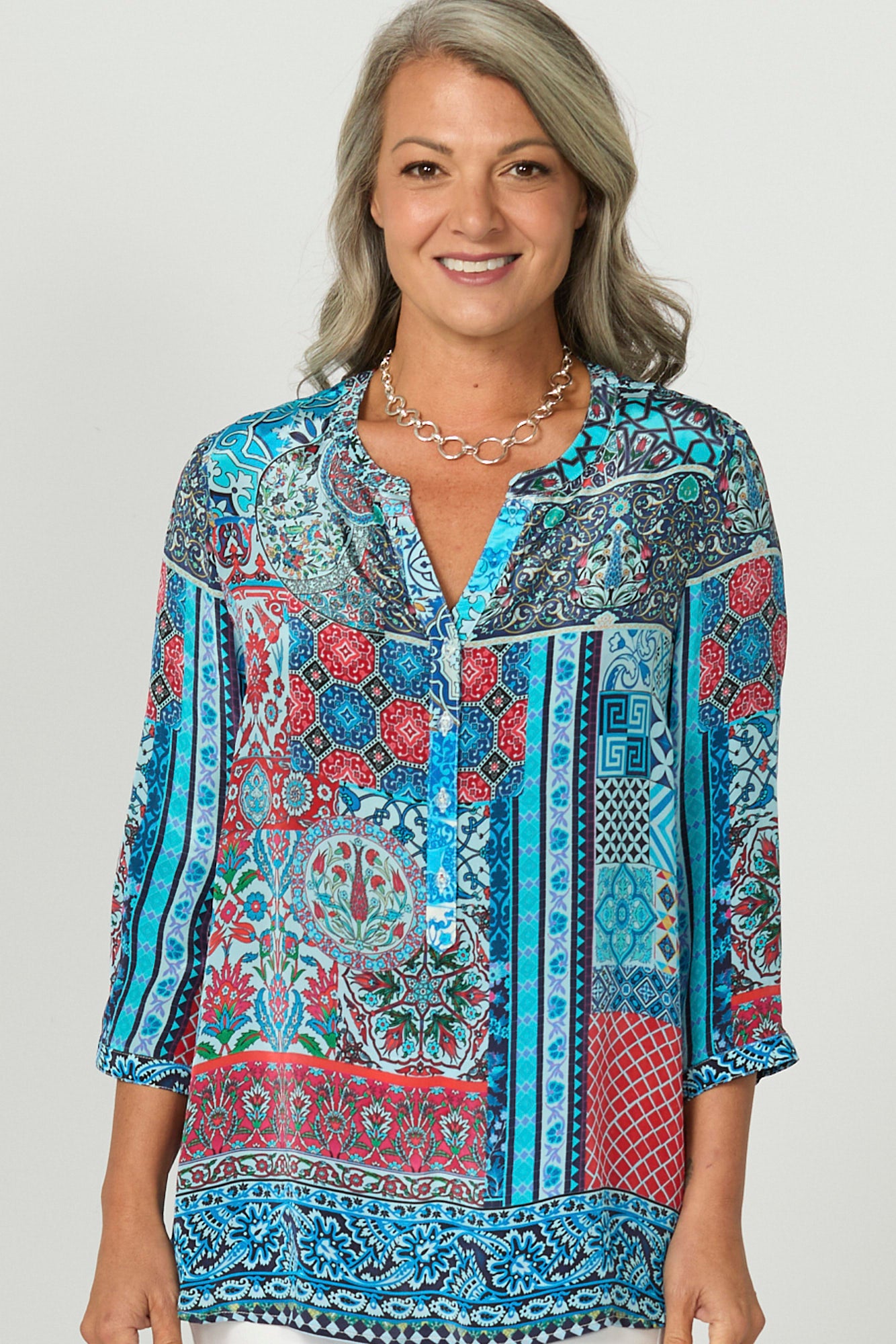Elevate your wardrobe with the Tiggy Popover Tunic in Teal Mix, featuring a teal mix print. This tunic combines style and comfort with its soft, silky hand feel and a unique round neck with a V-insert. The button-down placket to the waist, curved hem, and side hem splits add thoughtful details, making it a standout piece for any occasion.