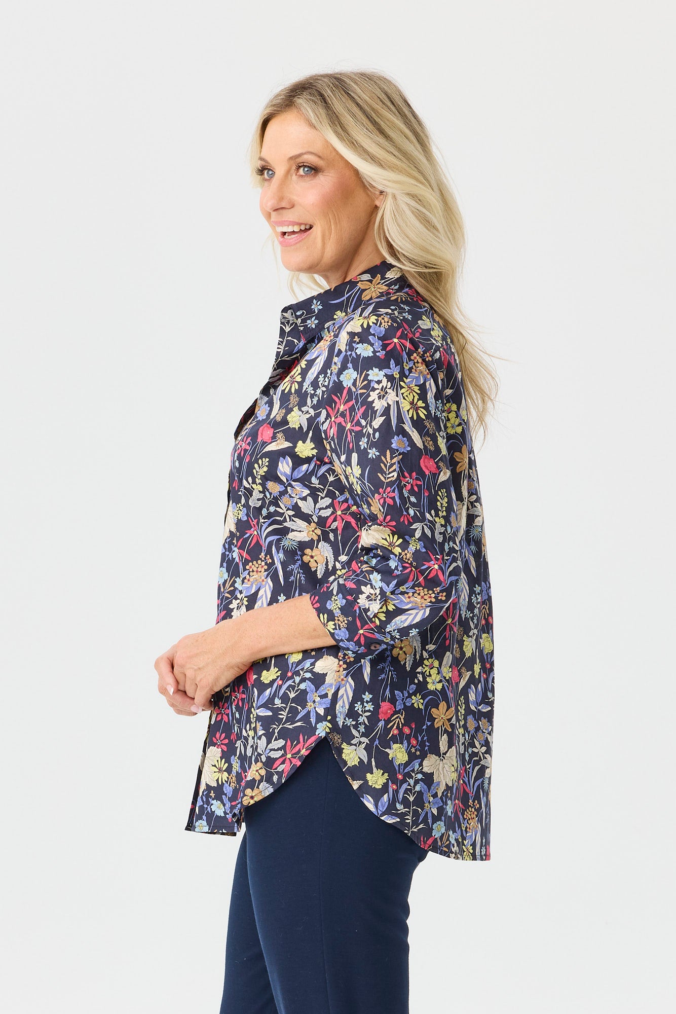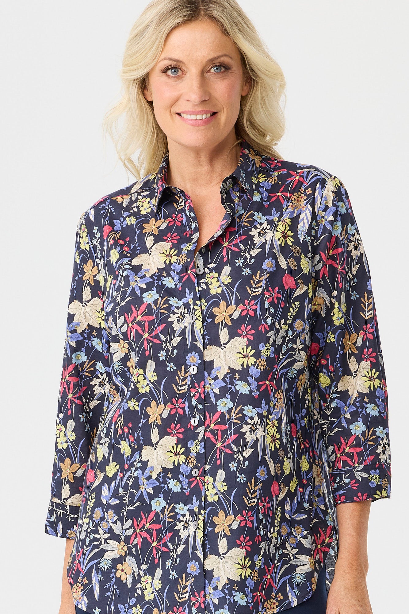 Delight in vibrant elegance with the Vanessa 3/4 Sleeve Shirt in Navy Multi. Made in Australia from luxe Japanese cotton voile, this shirt features a colourful botanical print that brings freshness to your wardrobe. The classic stand collar, cuffed sleeves, and curved hem enhance its timeless appeal.