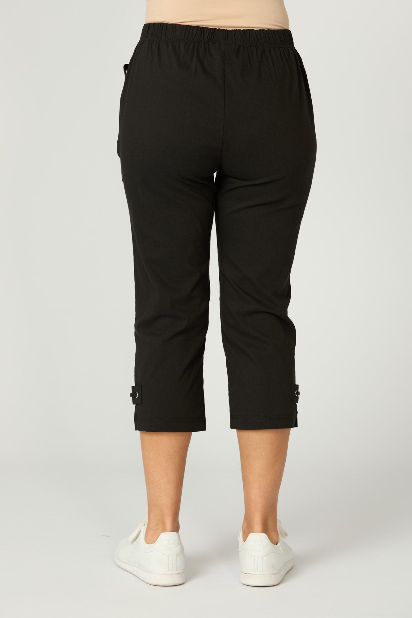 Be stylishly comfortable in these Vibe Stretch Crop Pants. The crop leg with side split detail features a small rectangular self-fabric panel with laced through silver coloured eyelets. The eyelets are carried through on the front welt pockets for added detail. Made from a lightweight Cotton-blend fabric, with a comfortable elastic waist band, you’ll be reaching for these pants everyday.