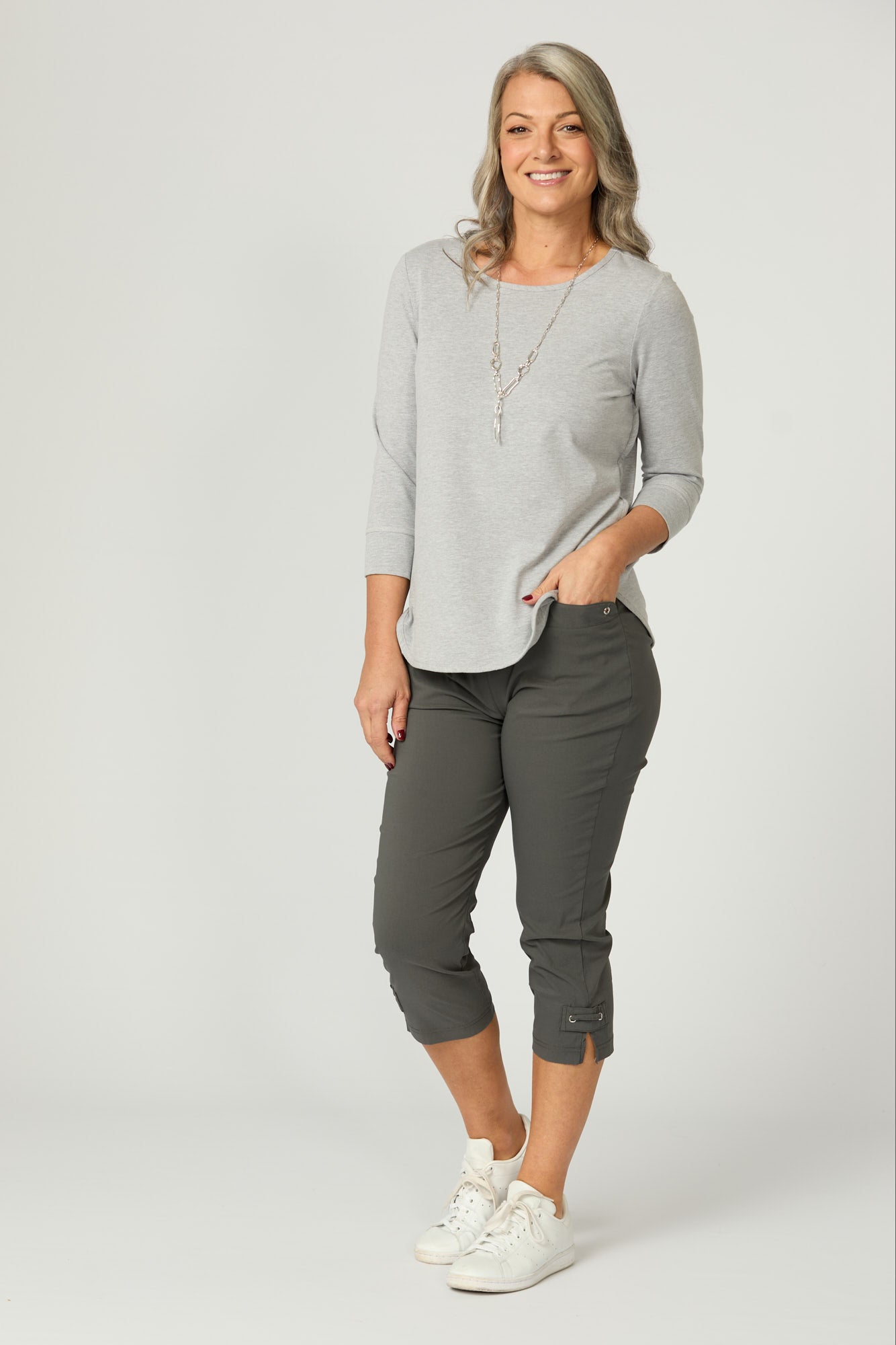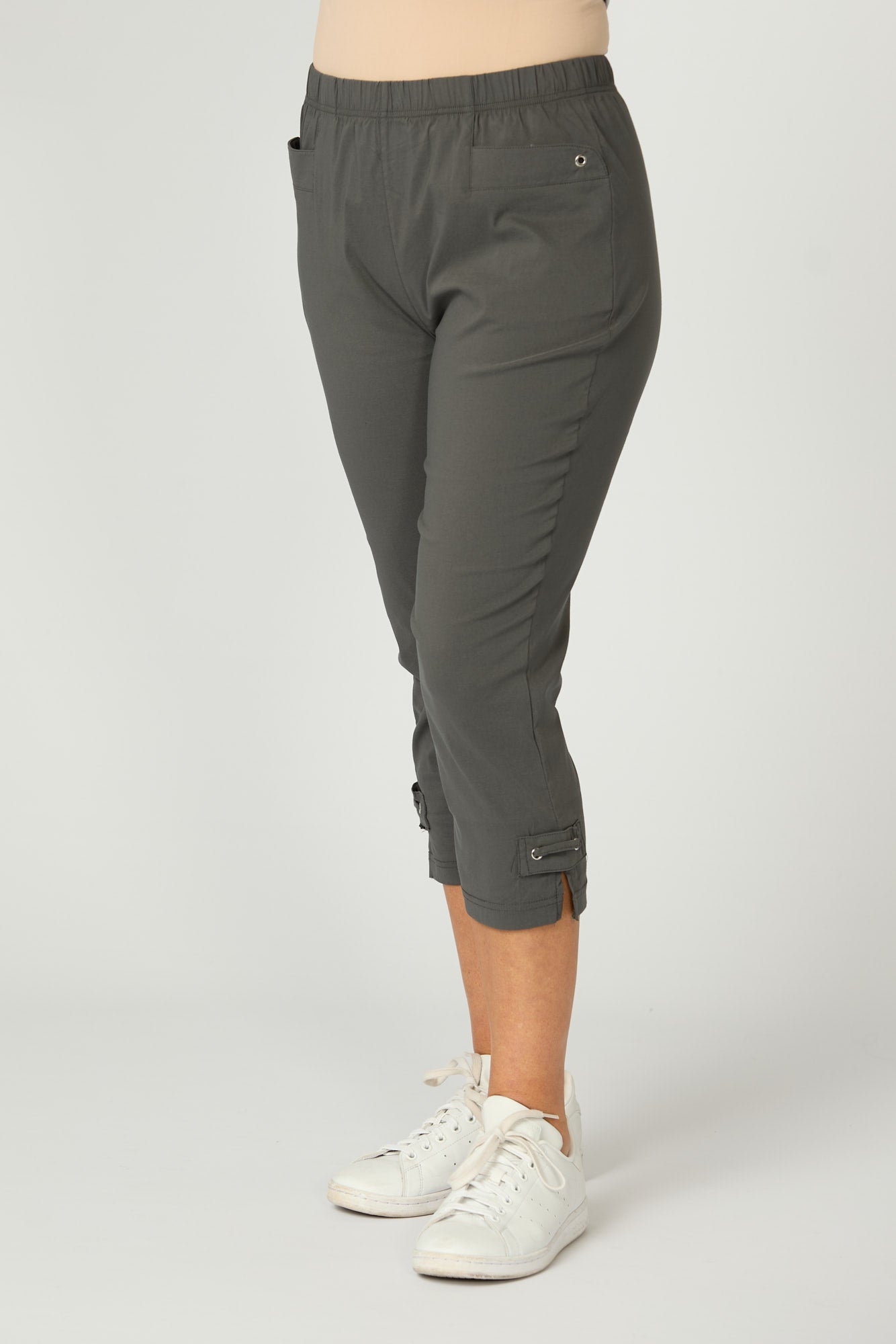 Be stylishly comfortable in these Vibe Stretch Crop Pants. The crop leg with side split detail features a small rectangular self-fabric panel with laced through silver coloured eyelets. The eyelets are carried through on the front welt pockets for added detail. Made from a lightweight Cotton-blend fabric, with a comfortable elastic waist band, you’ll be reaching for these pants everyday.