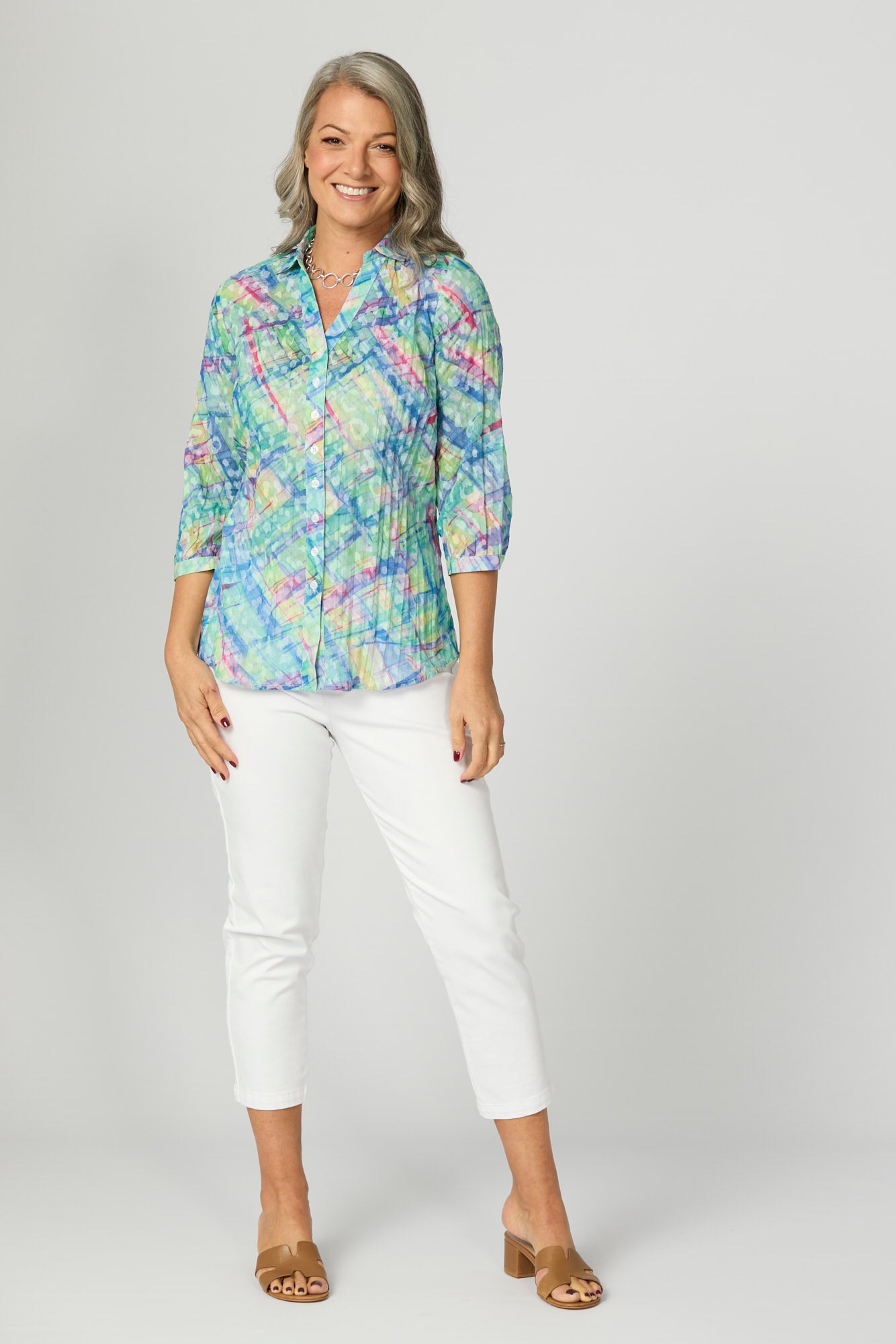 Discover effortless elegance with the Vista Crushed 3/4 Sleeve Print Shirt in Watercolour Check. This check print shirt features a textured fabric for added visual interest. The classic collar with a V-neck insert and button-down front offers a timeless look, while the front seams ensure a flattering fit. The 3/4 sleeves with cuffs and a curved hem provide both style and comfort. The front yoke seam adds a refined finishing touch.