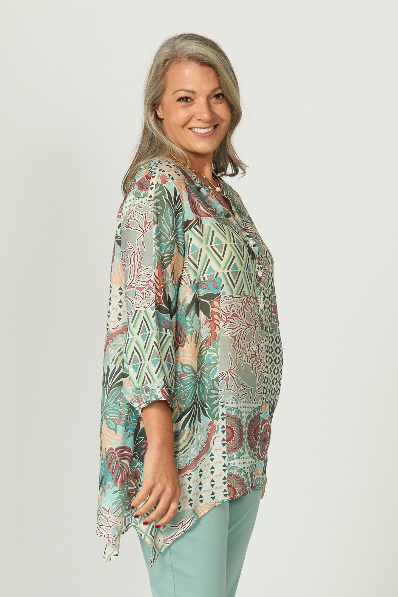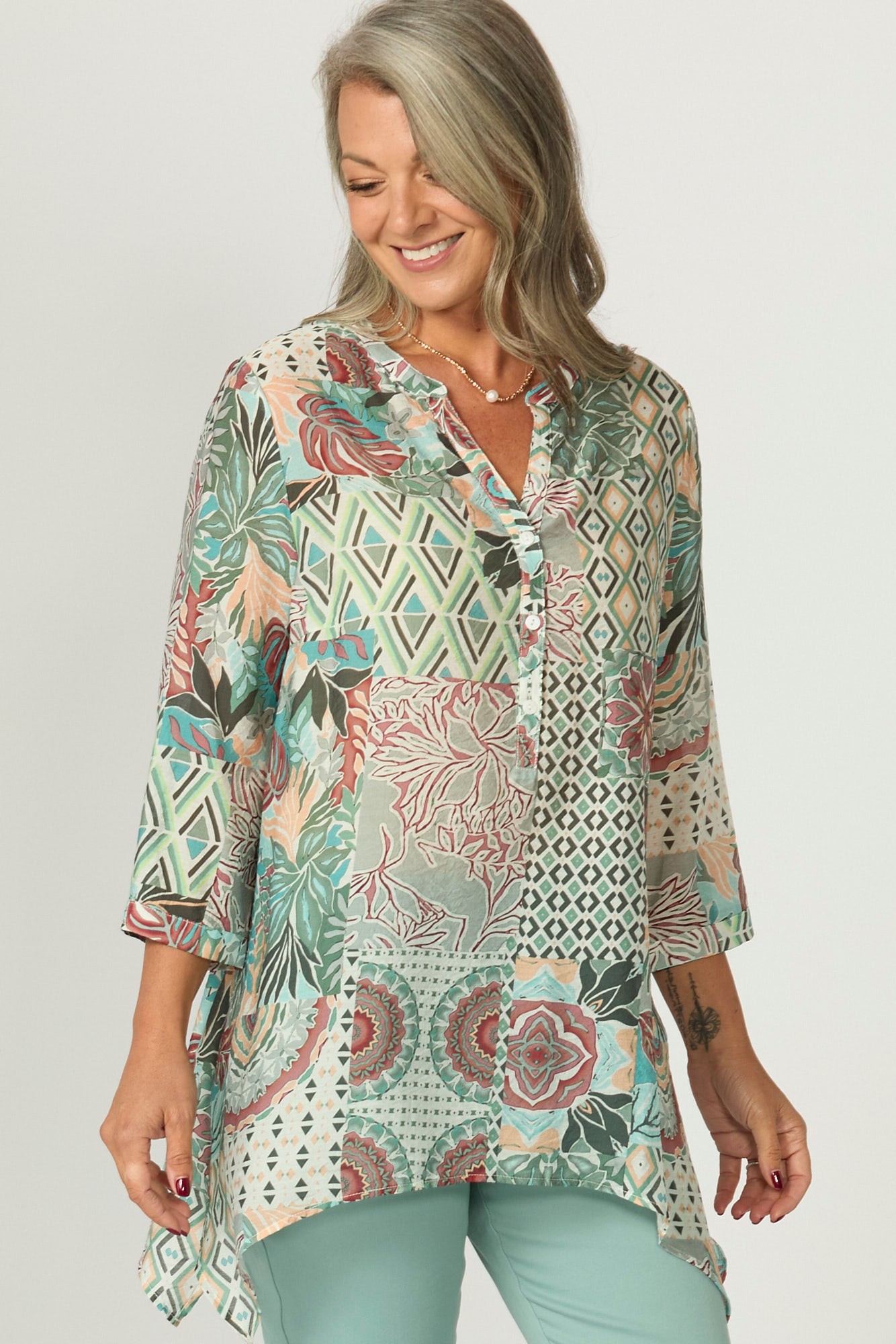 Brighten your look with the Zac 3/4 Sleeve Sharkbite Blouse in Teal Mix. Featuring a playful patchwork of geometric and floral prints, this lightweight blouse flows beautifully with its asymmetric hem and relaxed fit. The soft neckline with button detailing adds charm to this standout style.