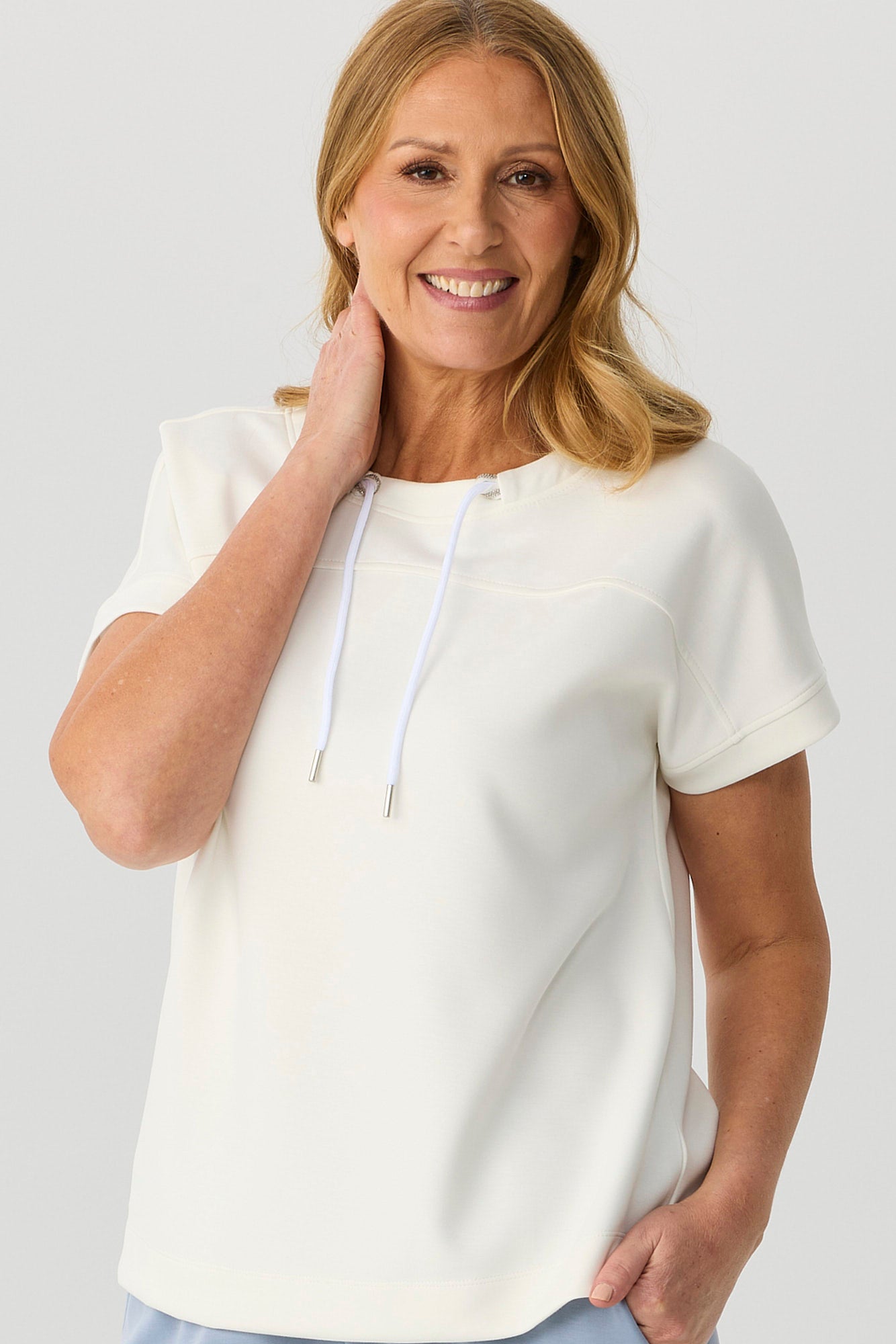Refresh your casual wardrobe with the Zen Relaxed Short Sleeve Top in Ivory. Blending sporty luxe with everyday ease, this top features a relaxed fit with modern drawstring front ties and soft dropped shoulders. The wide hem and subtle seam detailing elevate its laid-back charm.