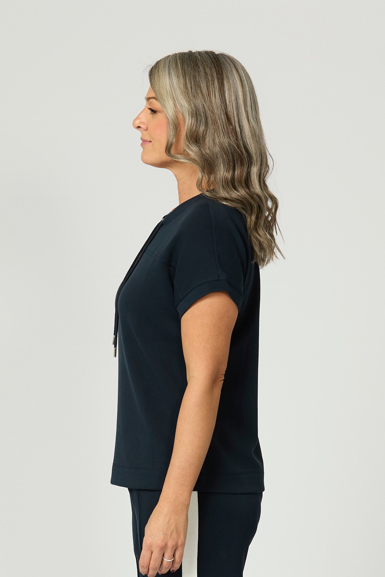 Refresh your casual wardrobe with the Zen Relaxed Short Sleeve Top in Navy. Blending sporty luxe with everyday ease, this top features a relaxed fit with modern drawstring front ties and soft dropped shoulders. The wide hem and subtle seam detailing elevate its laid-back charm.
